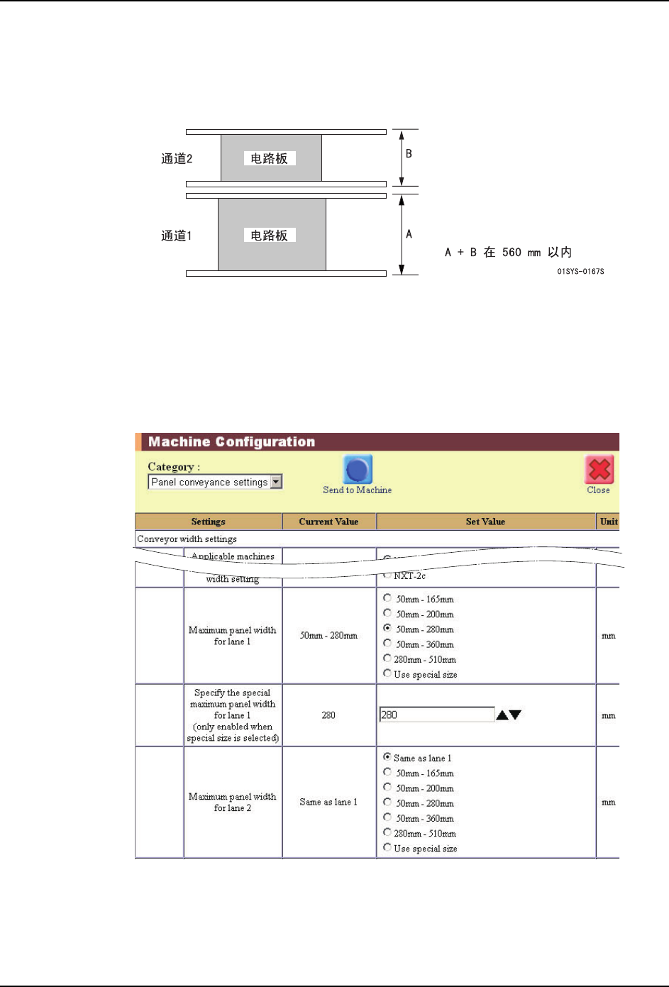 在双轨道生产时,在轨道 1 和轨道 2 中能够各自对应不同尺寸的电路板。请根据情况设定轨