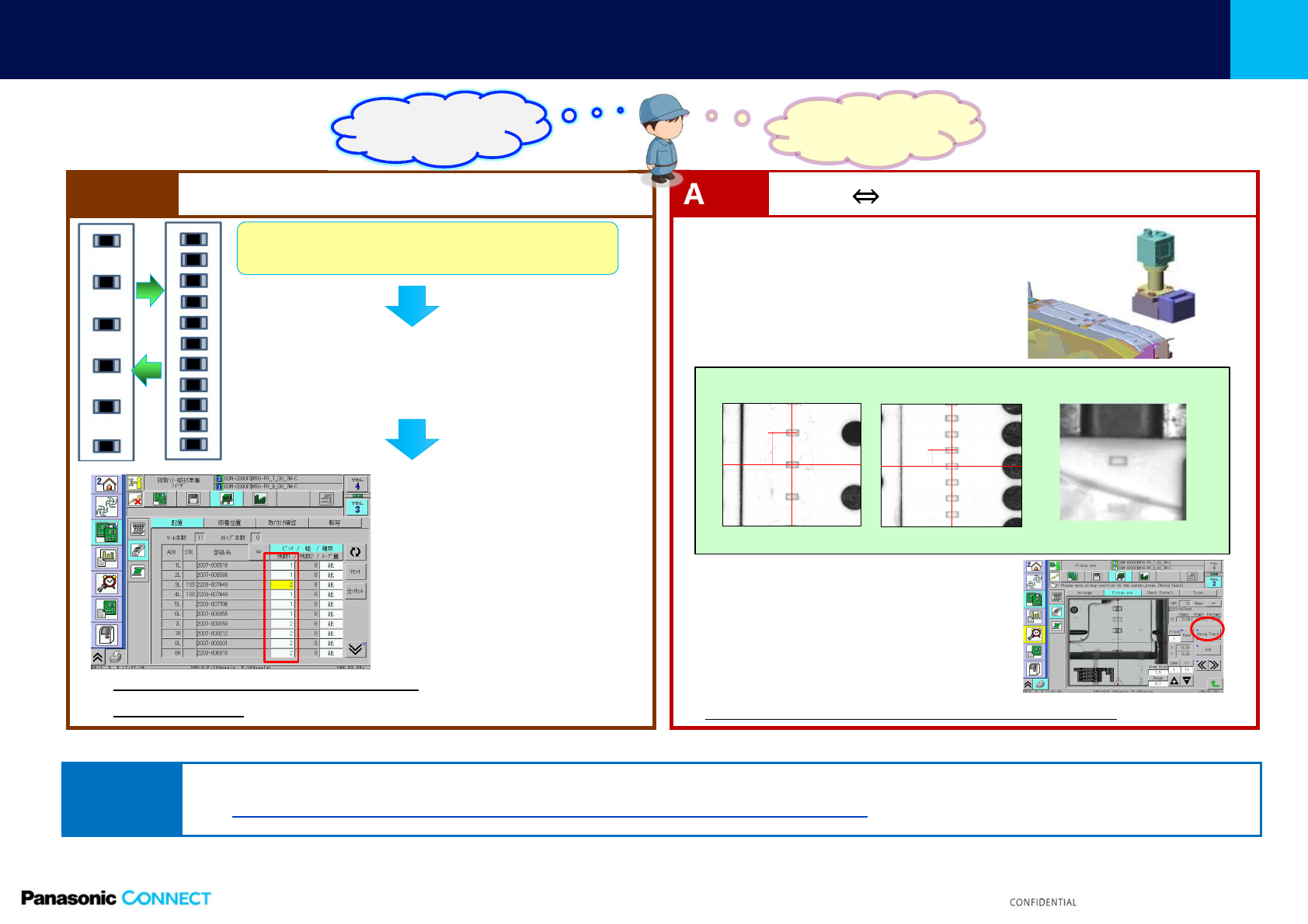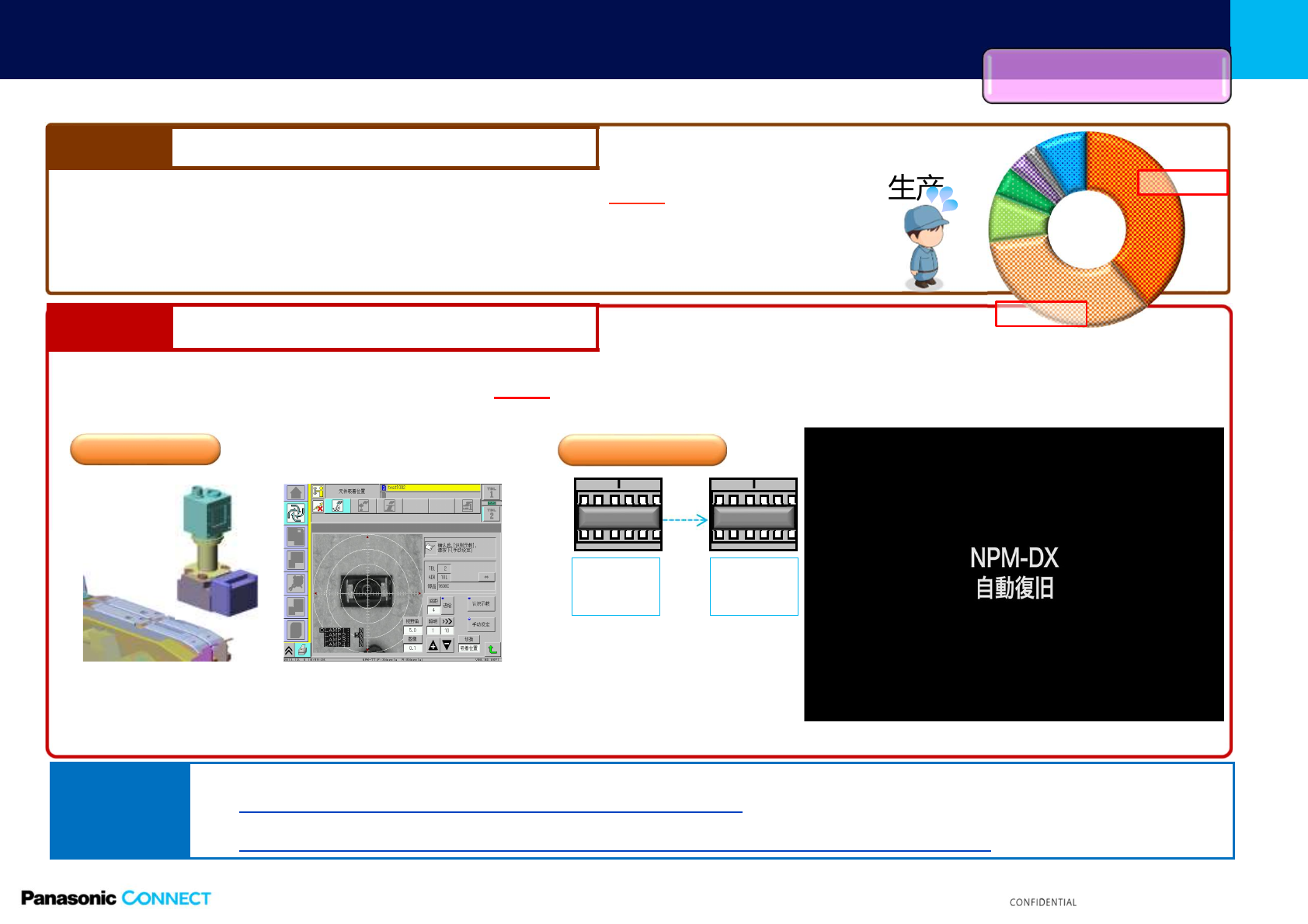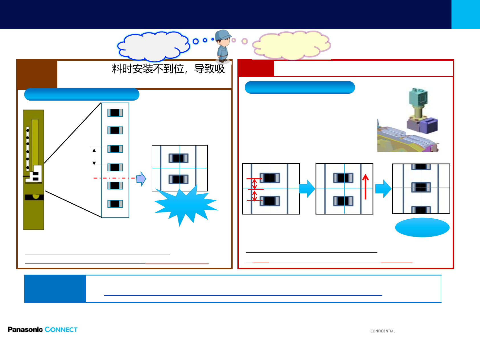 13 © Panasonic Factory Solutions Suzhou Co., Ltd. 2 022 NPM-WE 推荐功能;错误停止自动修复 (2) 由于元件上 料时安装不到位,导致吸 着位置错误发生 Before 检出半Pitc h偏移,自动补正 Af ter 4㎜编带元件编带安装错位半个Pitch—— 生产开始后的自动吸着位置教示 时 发生吸着位置错误 吸着位置 4㎜P 自动吸着位置教示时检测到偏移 自动供给2mm(半P…
