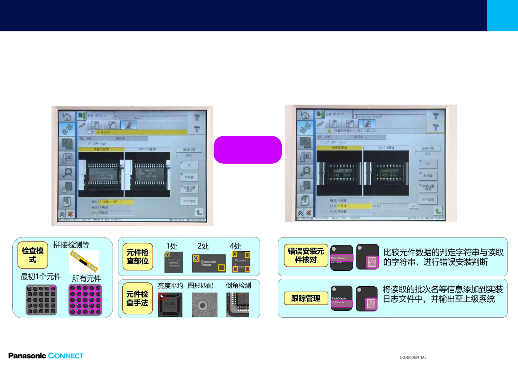 ●極性識別:防止錯誤實裝(有自動補正) ●字元識別:防止錯誤安裝、跟蹤管理