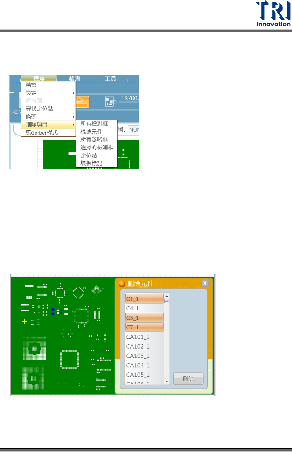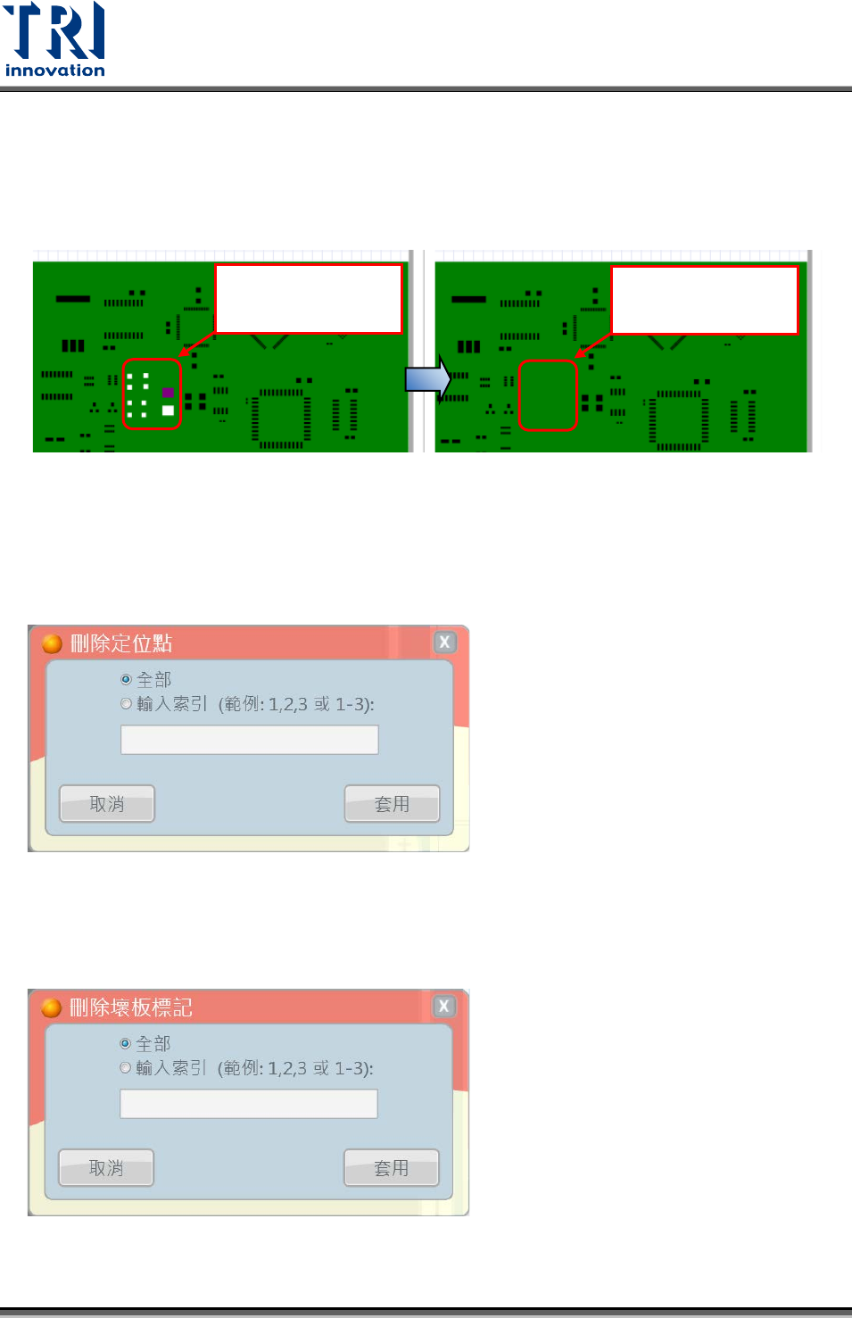 Test Research, Inc. 4.2.7.4 選擇的檢測框 先圈選 (CAD 框 ) 大圖的 檢測框,選取結果可參考下圖左側。接著點擊刪除項目中的所 選擇的檢測框,點擊後所框選的檢測框隨即被刪除,刪除結果可參考下圖右側。 4.2.7.5 定位點 選擇欲刪除的定位點, [ 全部 ] 代表刪除全部大定位點, [ 輸入索引 ] 可輸入欲刪除的定 位點編號。確認後按下 [ 套用 ] 按鈕即可刪除。 4.2.7.6 壞板標記 選擇欲刪除…