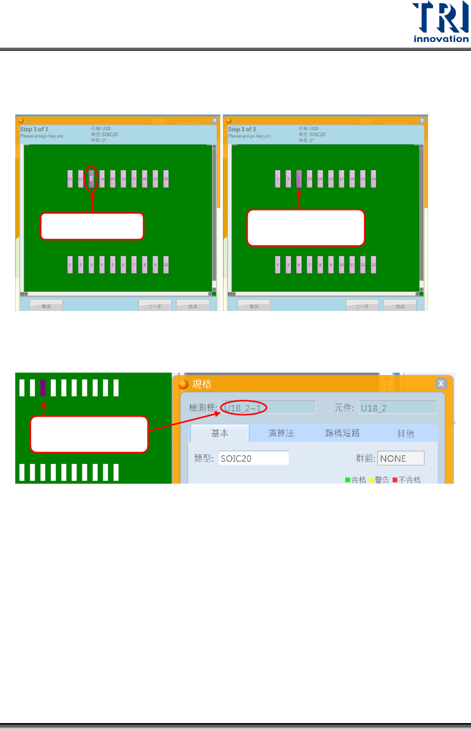 Test Research, Inc. 步驟 5. 點選欲設定為第一支接腳位置,將其編號改為 1 。程式將自動以逆時鐘方式修 正接腳編號。下左圖即為修改 13 號接腳為 1 ,下右圖為程式自動修正接腳編號 的結果。 步驟 6. 欲確認修改結果,可再次點選檢測框後,點選規格。從規格中的檢測框資訊確 認。下圖右側即為 13 號接腳修改編號 ( 改為 1) 的檢測框資訊範例圖。 點選後鍵入數字 1 以此框為起始編號 (1) ,逆時針排序 檢測…