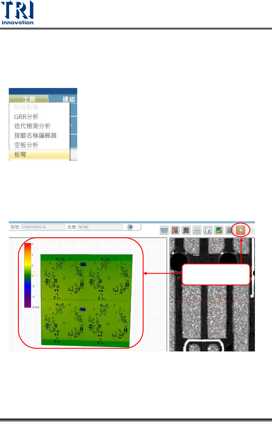 量目前板子的板彎狀況。下圖為板彎功能位置圖。操作範例接續於下圖。