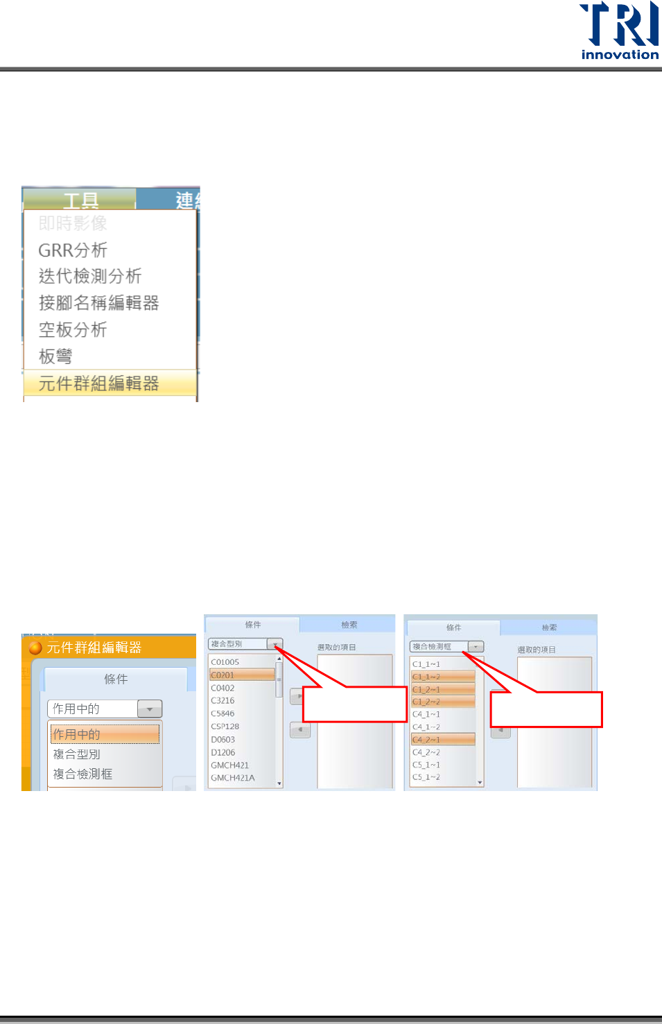 使用工具選單內的元件群組編輯器,可讓主程式編輯檢測框的群組名稱。下圖為分析
