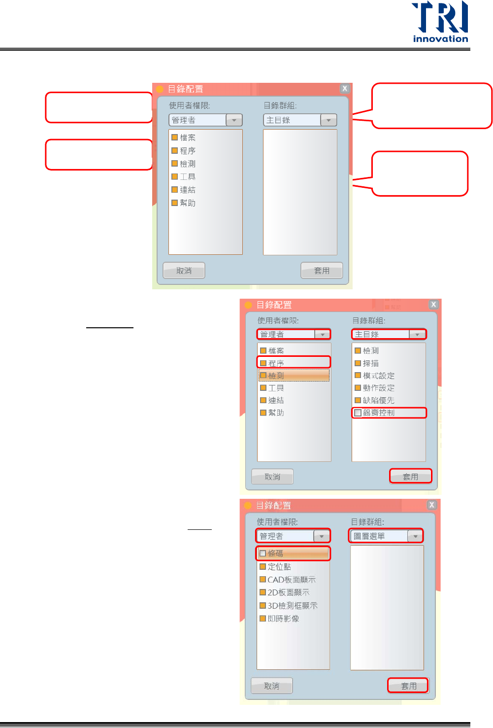 Test Research, Inc. 4.4.12 選單設定 關閉或開啟主選單功能使用步驟 ( 以關 閉程序選單的 錫膏控制 為例 ) : 步驟 1. 選擇欲編輯的使用者權限 步驟 2. 選擇更改主選單 步驟 3. 選擇主選單大項目 ( 或 者直接取 消選取關閉該大項目功能 ) 步驟 4. 取消選取關閉小項目功能 步驟 5. 點選 [ 套用 ] 確認設置 關閉介面上圖示使用步 驟 ( 以關閉 條碼 選 單為例 ) : 步驟 1. 選擇…