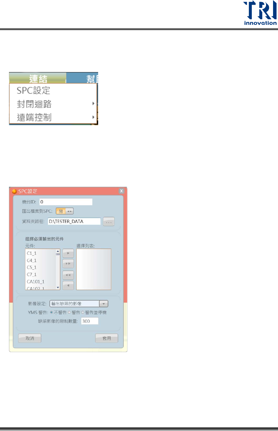 擇。視窗中可輸入機台 ID 名稱、是否開起匯出檔案到 SPC 功能、設定會出檔案的資