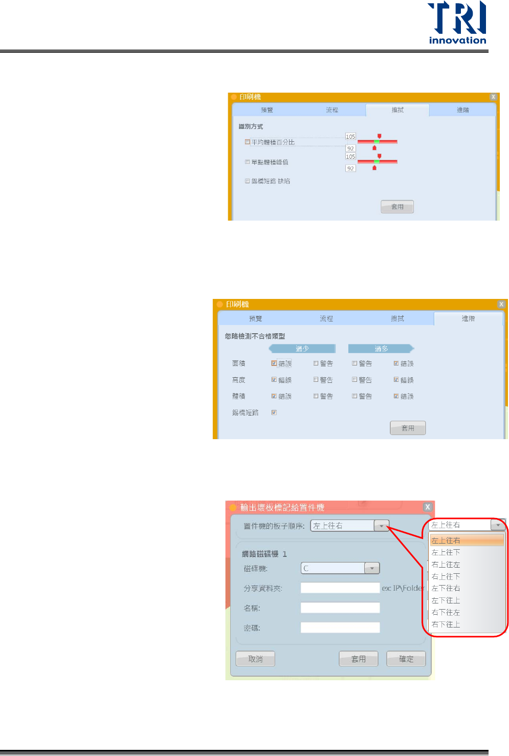 Test Research, Inc. 擦拭: 設定擦拭鋼板的條件。 1. 平均體積百分比:當整板錫膏的平 均體積超過所設的上 下限時讓錫膏 印刷機擦拭鋼板。 2. 單點體積峰值:當有錫膏的最高高 度超過所設的上下限 時讓錫膏印刷 機擦拭鋼板。 3. 錫膏短路缺陷:當有錫膏發生短路 的情況時讓錫膏印刷機擦拭鋼板。 進階: 設定那些錫點不計入 整板錫膏偏移 量的運算,以圖中面 積為例,面積 過少或過多 ( 不在面積標準上下限範 圍內 ) …