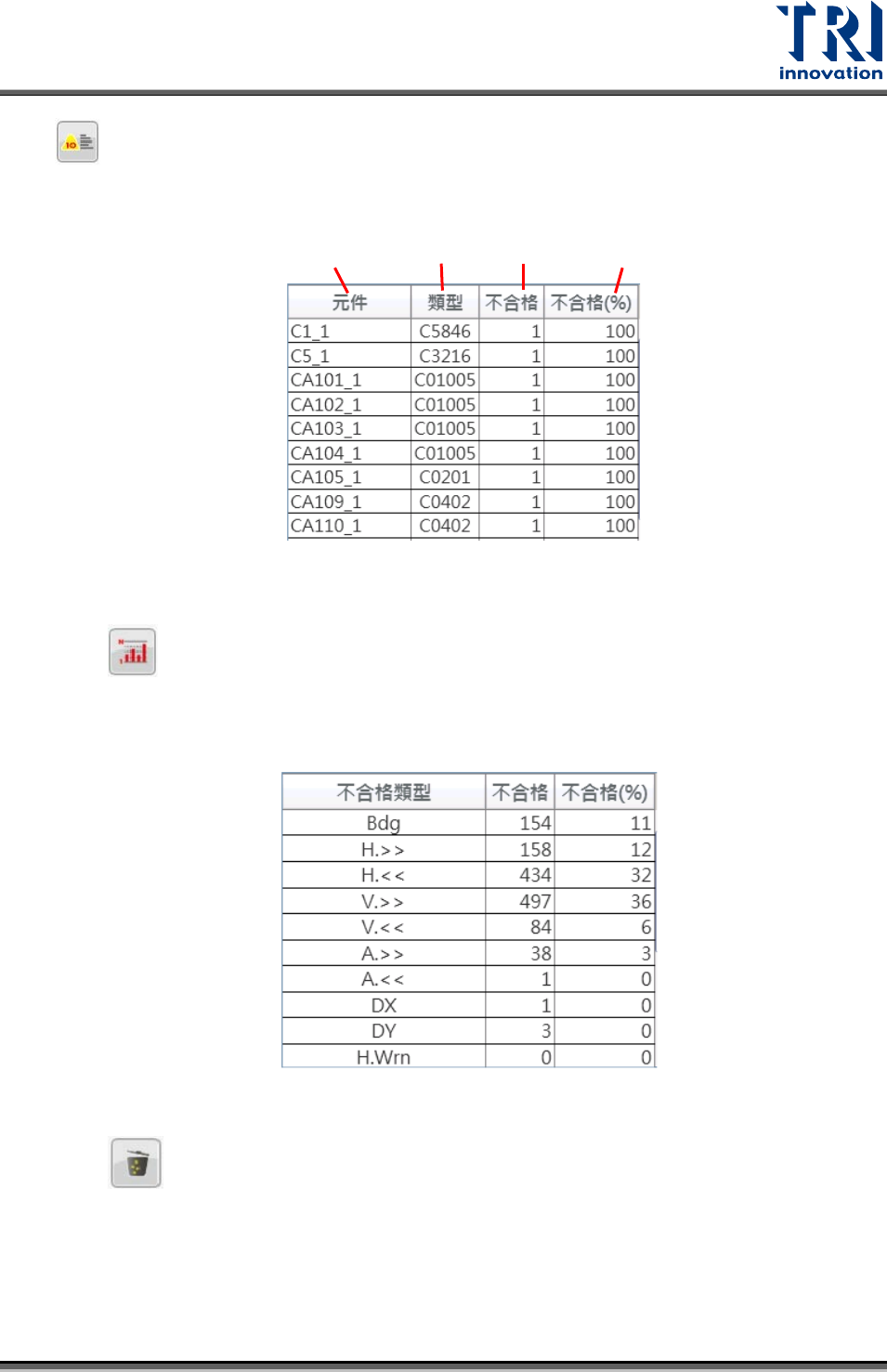 Test Research, Inc. 不良元件 Top 10 :點選後將發生不良的次數最多的元件前 10 名列出來。 依不良類型計數:統計不良類型發生的次數。 點選後系統重新計算直通率、不良元件 Top10 不良類型 不良類型 發生次數 不良類型 發生機率 元件發生 不良機率 元件發生 不良次數 元件類型 不良元件 前 10 名 TR 7007 Series User Guide – Software 15