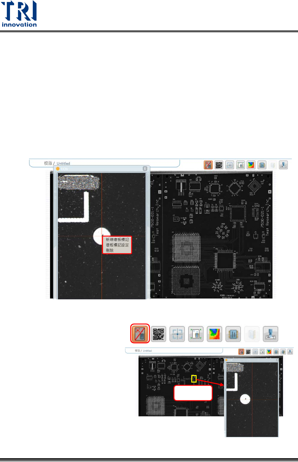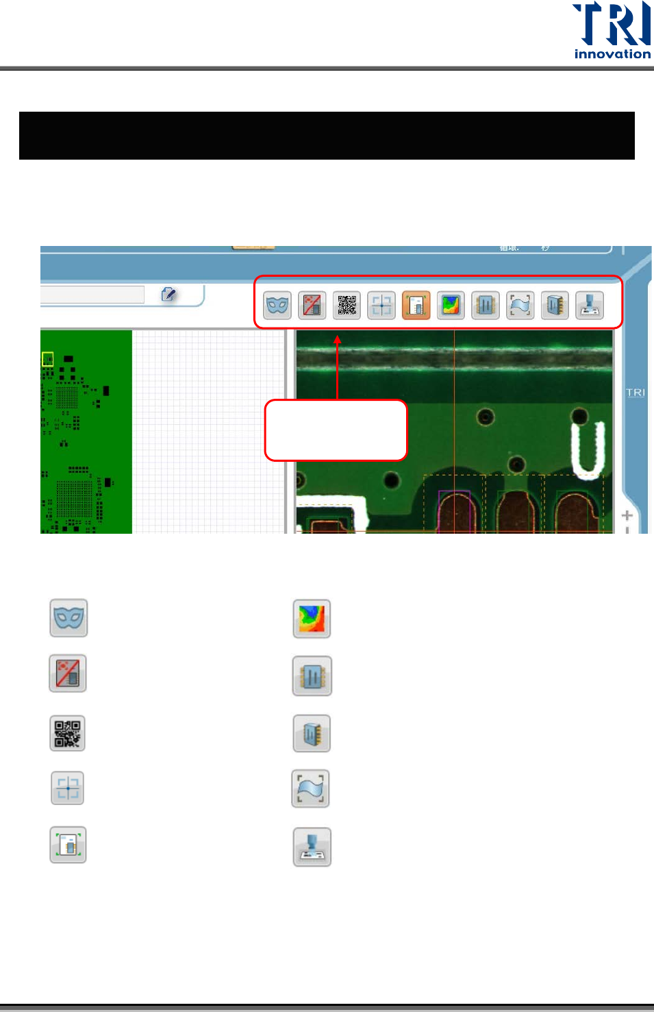 Test Research, Inc. 3 快捷功能列表 此章節 將 介紹 程式中熱鍵 功能及對應的 大圖影像 的功能說明。快捷 鍵功能 如下圖所示, 其所包含的功能將於後續依序介紹。 圖示中文標註說明: 凹槽遮罩 HAV 分佈圖 壞板標記 2D 板面顯示 條碼 錫膏 3D 影像 定位點 變型視圖 CAD 圖 即時影像 快捷建功能列 TR 7007 Series User Guide – Software 23