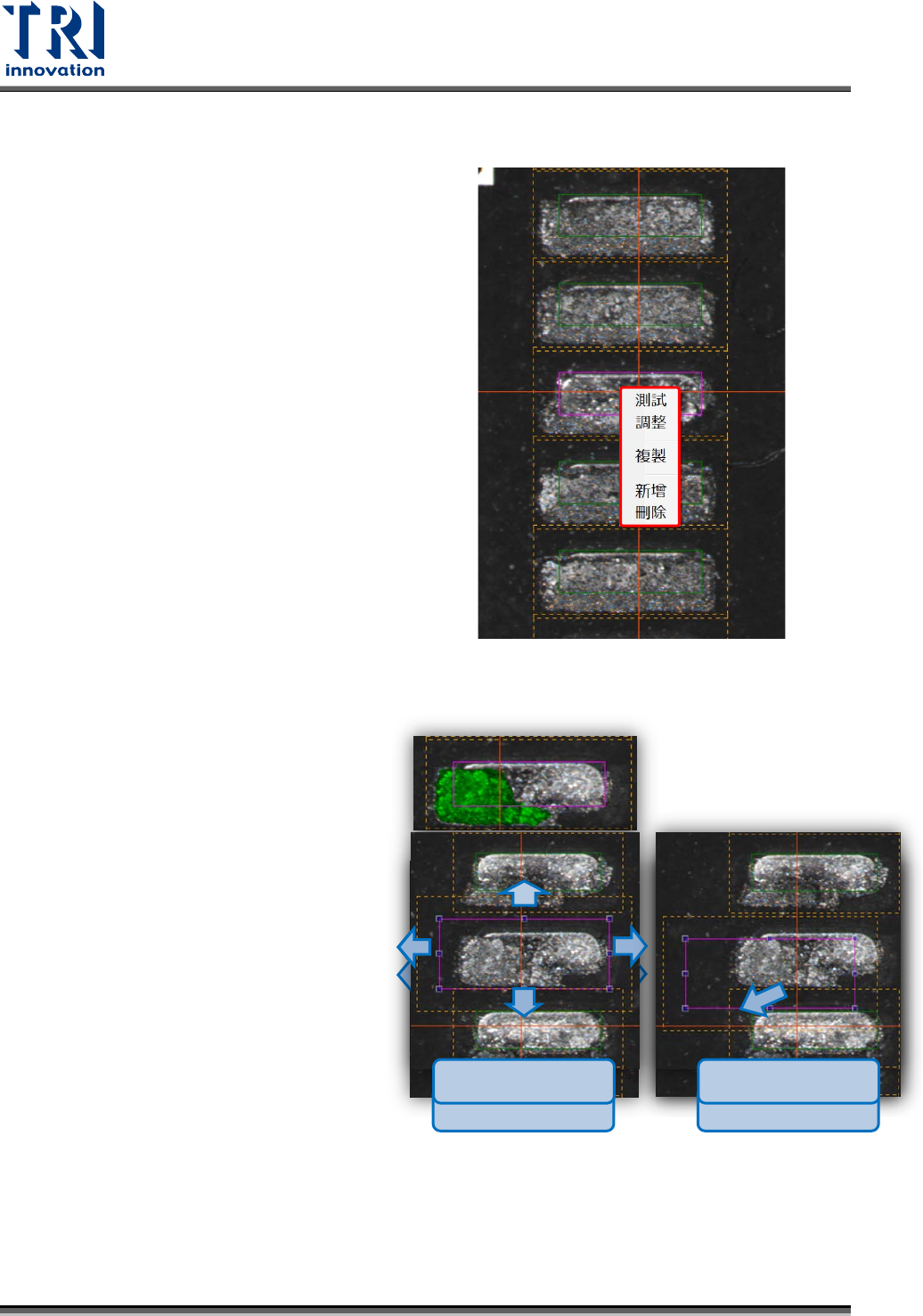 Test Research, Inc. 3.5 C AD 框 點擊 CAD 框圖示時,可看到 CAD 框位置分布圖 雙擊大圖上想檢視的地方, FOV 出現。 TR 7007 Series User Guide – Software 39