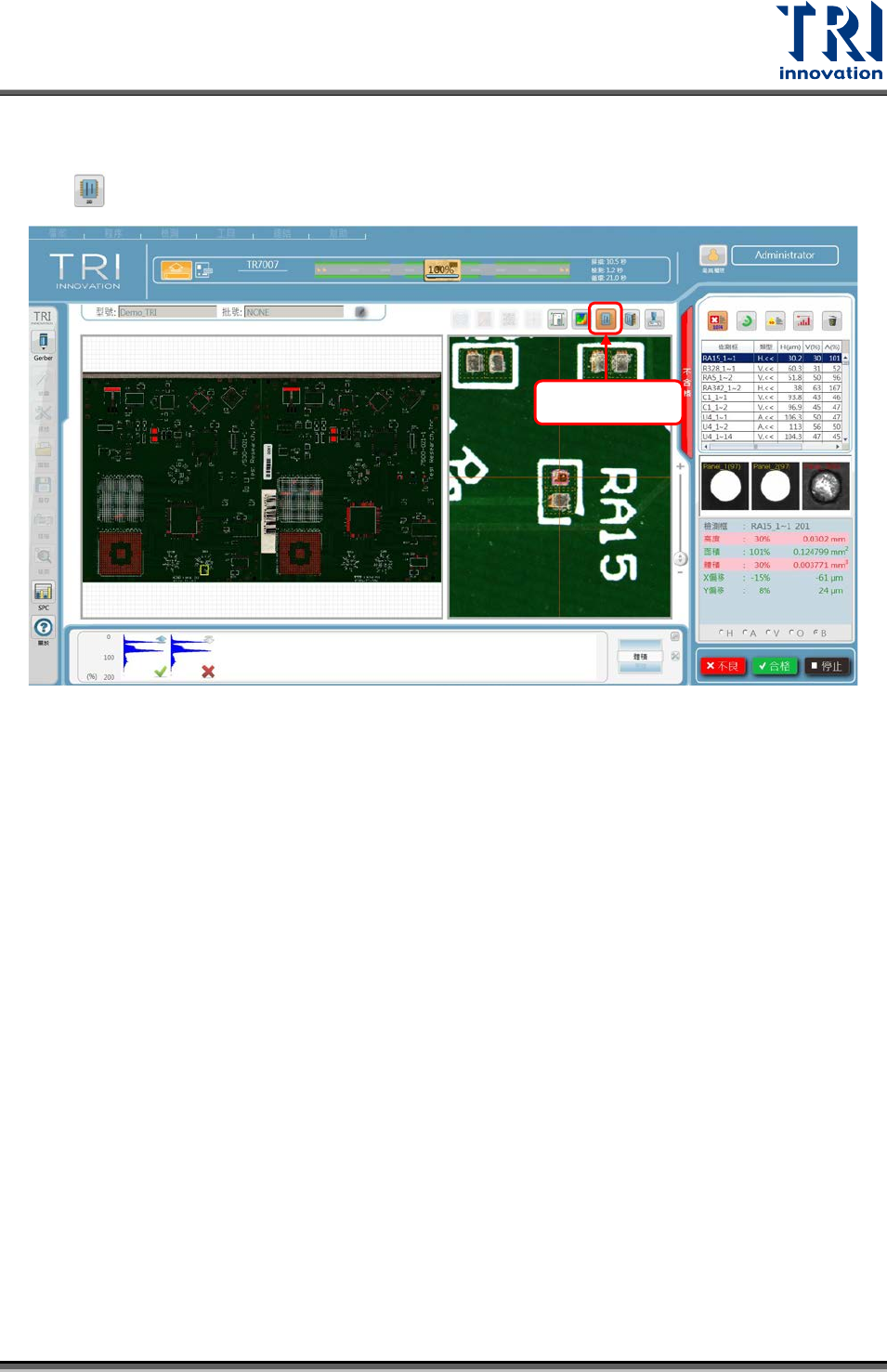 Test Research, Inc. 3.8 檢視當前 錫點之 3D 圖 按 ctrl+shif t 鍵會出現 x 方向與 y 方向剖面圖以及色彩等高線圖。 3D 視圖 X 方向剖面 圖 Y 方向剖面圖 色彩等高線 圖 顯示鋼板厚度 錫膏 3D 圖 紅十字線位置高 度 44 TR 7007 Series User Guide – Software