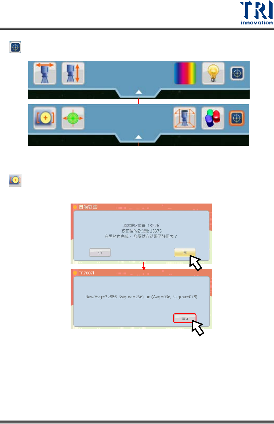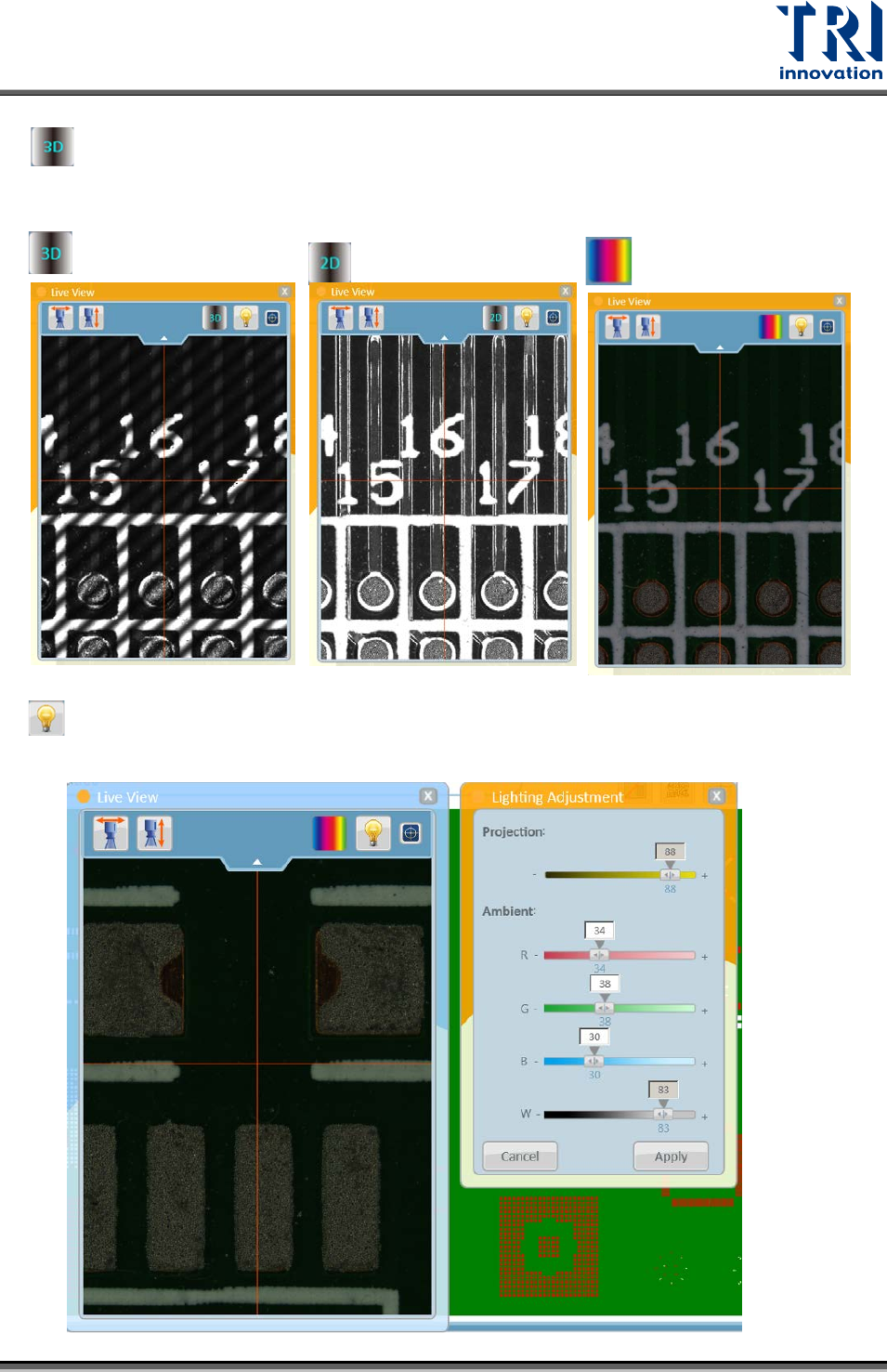 Test Research, Inc. 舉例來說,若想調整紅色燈源,須調整至彩色即時影像才可拉紅色滑桿調整紅燈亮度 界面介紹: 條紋光 紅色燈源 綠色燈源 藍色燈源 白色燈源 須先調整成彩色影像 須先調整成白光影像 須先調整成條紋光影像 50 TR 7007 Series User Guide – Software
