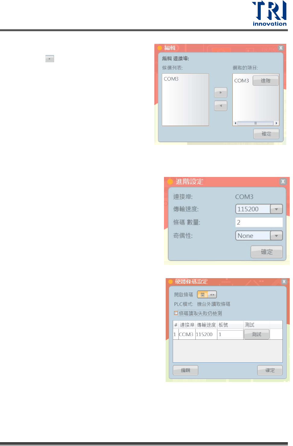 Test Research, Inc. 步驟 5. 選取 欲做為連接硬 體讀碼機 的連接埠 。 步驟 6. 點選 鍵將該連接埠套進 [ 選取的項 目 ] 。 步驟 7. 點選 [ 進階 ] 可進行進階的條碼設定。 步驟 8. 如右圖所示,可設定該讀碼機的傳輸速 度、條碼數量與奇偶性,編輯好後按 [ 確定 ] 。 步驟 9. 設定完成可讓讀碼機掃板子測試看看是 否按讀碼正常,擺好板子後按 [ 測試 ] 鍵 確認,如果正常則會跳出訊息視窗顯…