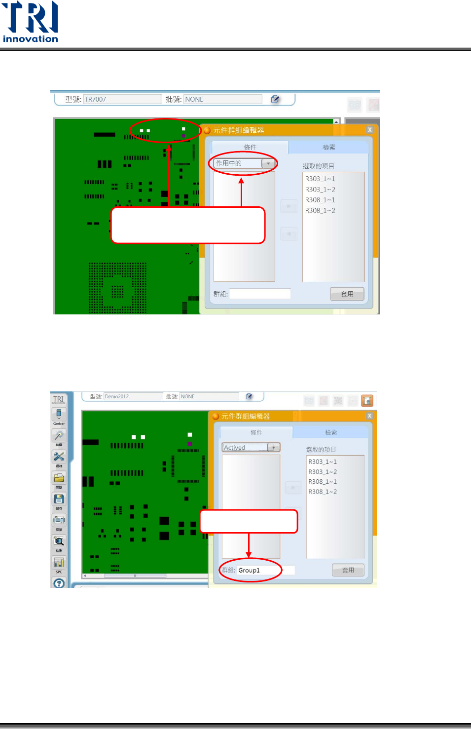 Test Research, Inc. 4.4.6 元件群組編輯器 使用工具選單內的元件群組編輯器,可讓主程式編輯檢測框的群組名稱。下圖為分析 的元件群組編輯器的點選位置圖。操作範例接續於下圖。 < 操作範例 > 步驟 1. 點擊元件群組編輯器後,設定條件下拉式選單包含作用中的、複合型別、複合 檢測框三個選項。 其中作用中的可由程式自動帶入已圈選的檢測框,進而編輯為同一群組。複合 型別可以類型做為選項,編輯為同一群組。複合檢…