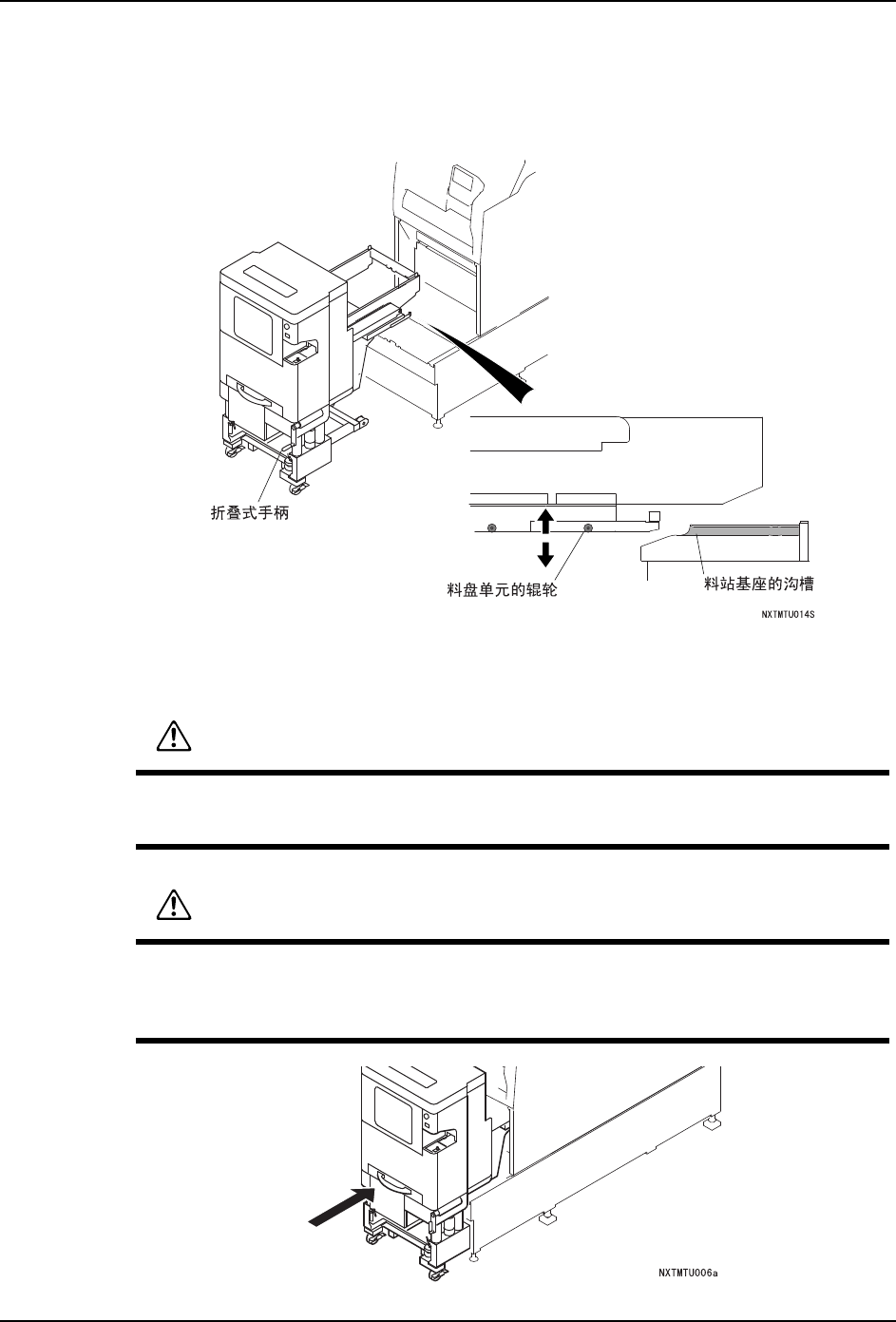 在将料盘单元压入机器时,请确认料盘单元盒基座之间是否有别的操作者。存在在料