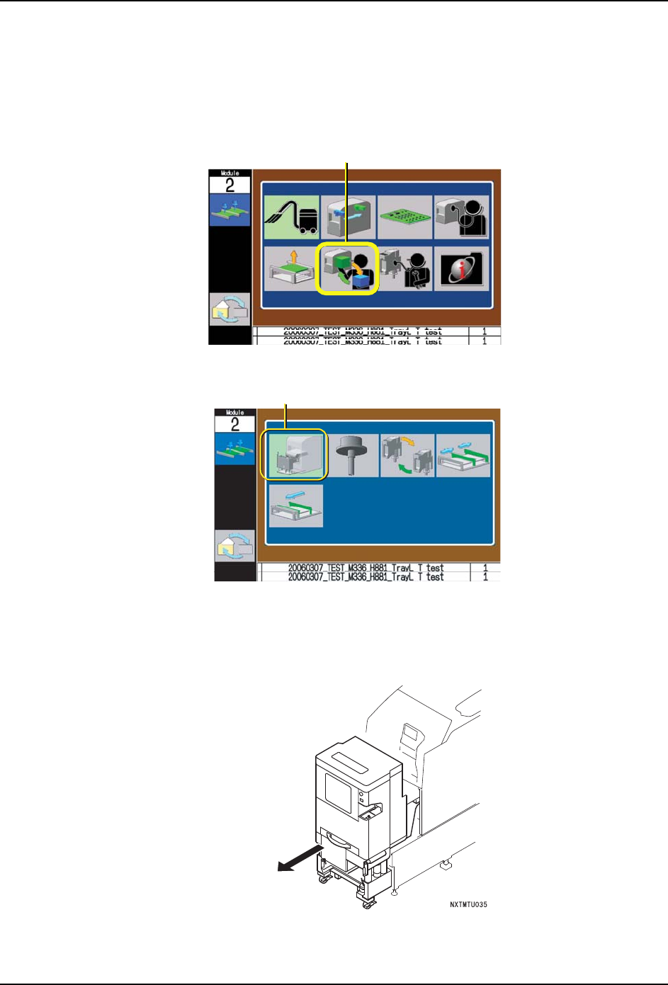 QD145-15 5. 基本操作 NXT II 机械手册 131 5.5.3 拆除方法 1. 停止模组的运转,使其处于 START 等待状态。 2. 按下 「MANUAL」按钮,显示出 手动指令。 3. 使用剪头键,选择更换单元示意图。按下 「OK 」按钮。显示出更换选项画面。 4. 选择更换托架示意图。按下 「OK」按钮。松 开料盘单元 -L。 5. 带有料盘吸取器的料盘单元 -L 的时候,请从 NXT 基座孔中拆除限制装卸用链 的挂…