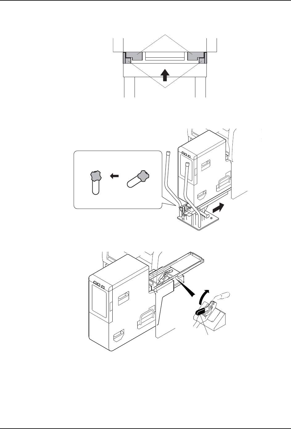 4. 转动摇柄调整台车的高度,使台车的轨道上面与料盘单元 -M 的底部接触。