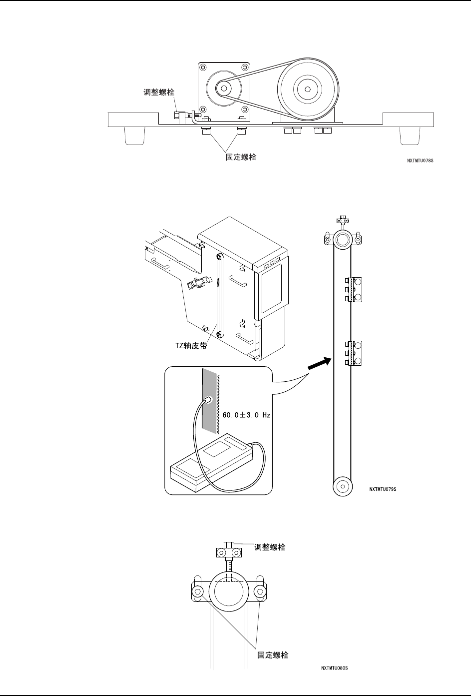 QD145-15 6. 预防保养 NXT II 机械手册 313 2. 测定值超过上述的范围时请调整皮带张力 。拧松马达的固定螺栓后,旋转调 整螺栓进行 调整。 〈TZ 轴皮带张力〉( 料盘箱升降部 ) 1. 请测定皮带的张力。确认在跨距最长的皮 带中央的测定值是 60.0±3.0Hz。 2. 测定值超过上述的范围时请调整皮带张力 。 请松开张紧轮的固定螺栓后,旋转 调整螺栓进行调整。