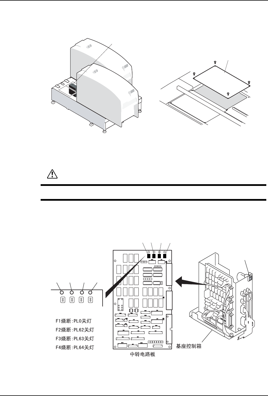 3. 对于中转电路板内的保险丝,在确认烧断的保险丝是哪一根后,将主电源开关 OFF。