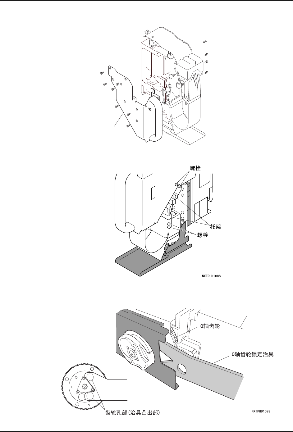 6. 预防保养 QD145-15 246 NXT II 机械手册 3. 请拆除侧面的盖板。 4. 如图所示拆除螺栓,使托架松动。 备注 )请用短的扳钳拆除螺栓。 5. 请用专用治具固定。使齿轮孔可以卡住凸 出部安装治具。 Ⲫᵓ 1;73+'6