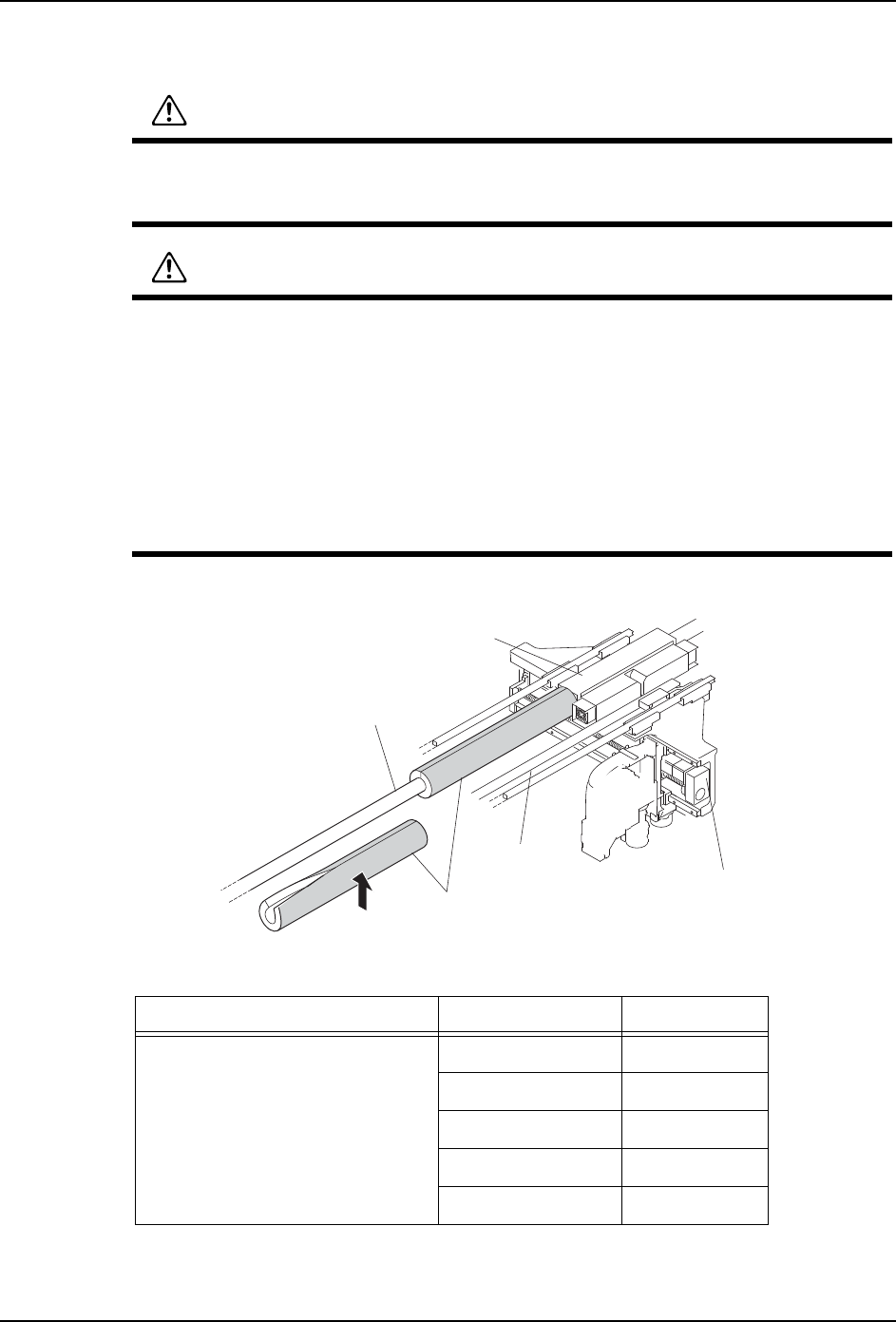 6. 预防保养 QD145-15 252 NXT II 机械手册 6.8.6 XY 机械手的加油 请在线性马达轴到常温后再安装 保护盖罩。 〈M3-2 模组时〉 备注 )Fuji 润滑油枪套件的润滑油枪 1 次喷射量约 0.6cc。请作为加油的参考值。 表中的加油量是对于 1 根滚珠丝杆、1 个 LM 导轨滑块的加油量。 警告 模组刚运转后,请不要直接触摸 线性马达的轴和线圈部分。有可能 因高温被灼伤。 模组的线性马达有强力的磁性。 使…