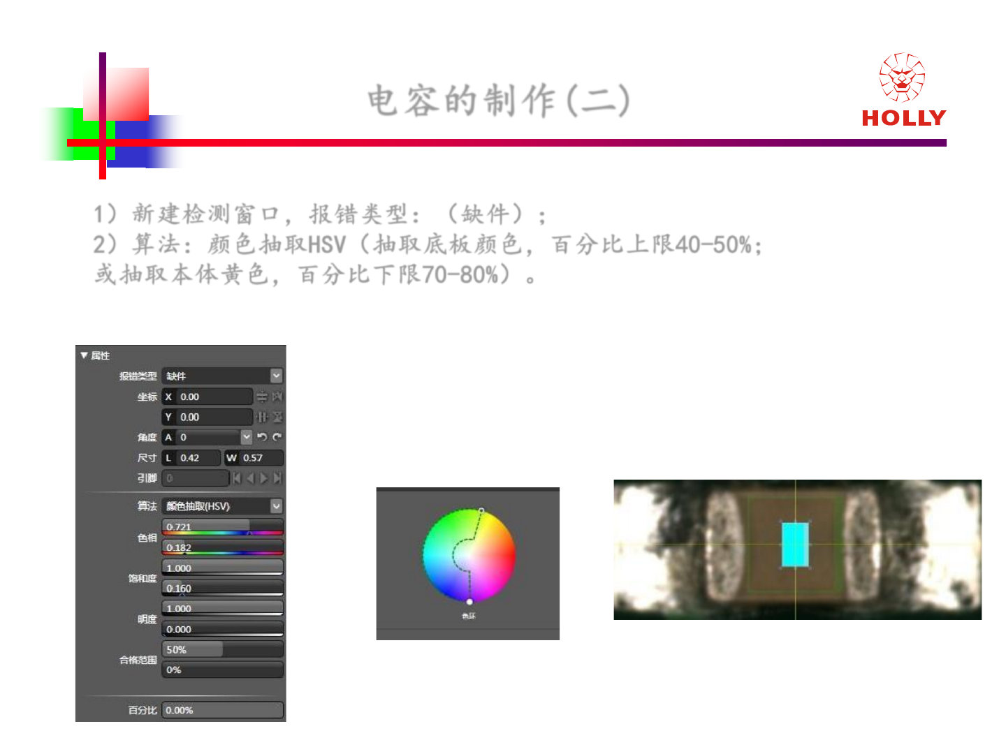 版權所有: 2006 赫立國際控股有限公司 Ho lly International Holdings Corporation 电容 的制作 ( 一 ) 1 ) 新建检 测窗口 ,框住 整个焊 盘; 2 ) 算法: 全板 匹配剔 除