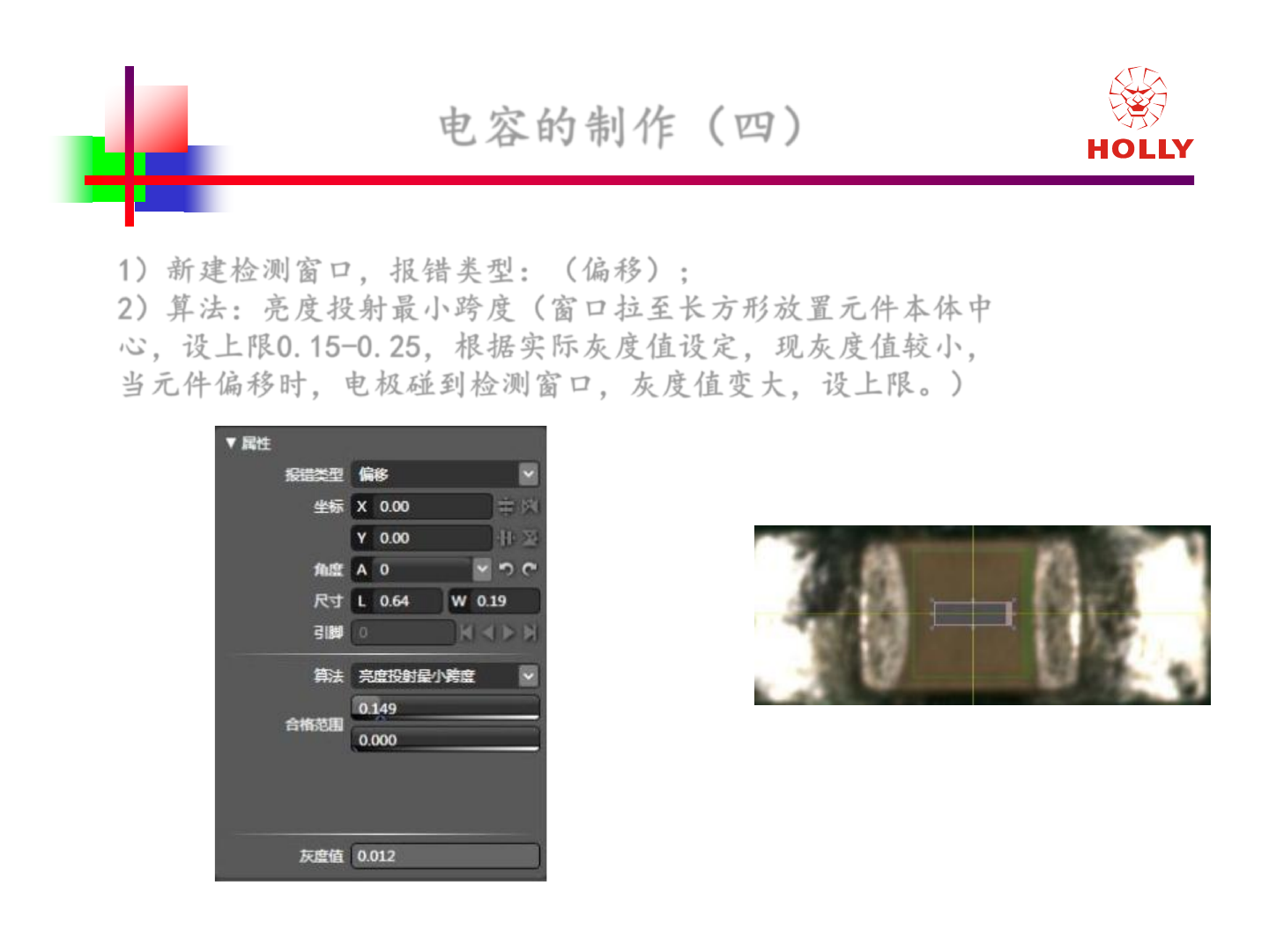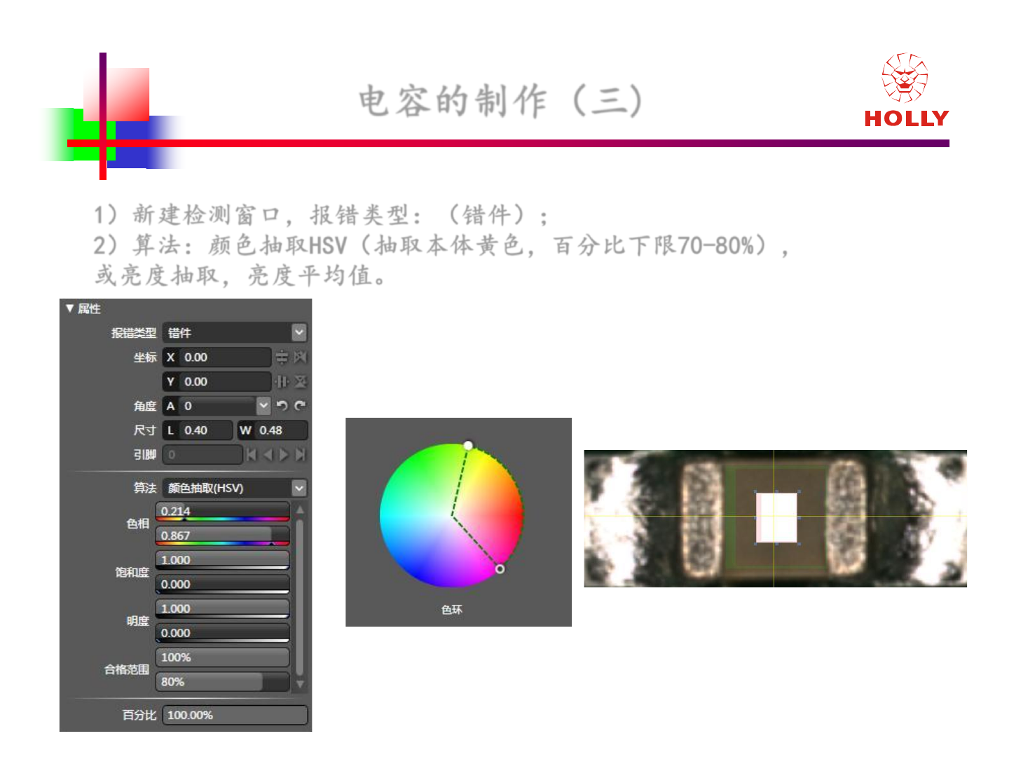 版權所有: 2006 赫立國際控股有限公司 Ho lly International Holdings Corporation 电容 的制作 (三 ) 1 )新建检测窗口,报错类型: (错件) ; 2 ) 算法:颜色抽取 HSV (抽取本体黄色, 百分比下限 70 - 80% ), 或亮度抽取,亮度平均值。