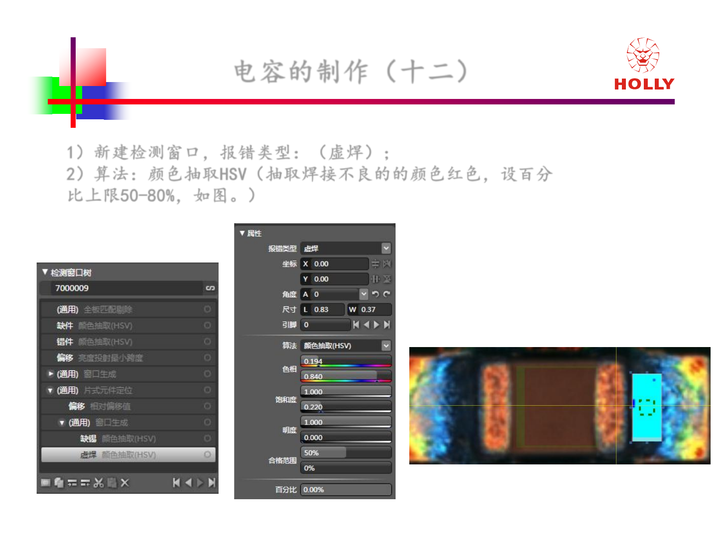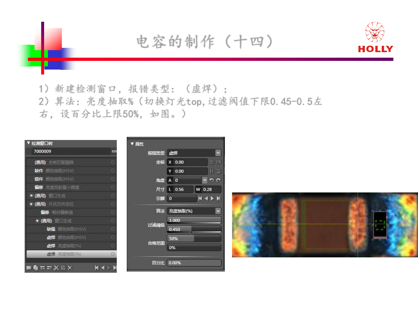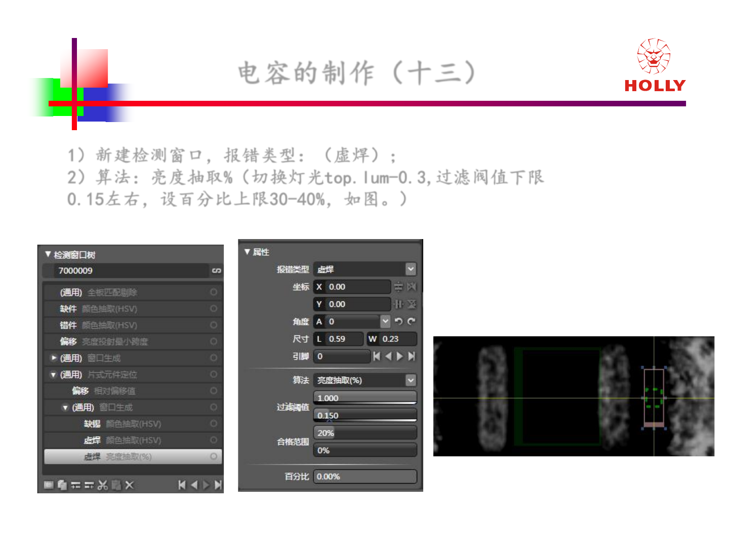 版權所有: 2006 赫立國際控股有限公司 Ho lly International Holdings Corporation 电容 的制作 (十三) 1 )新建检测窗口,报错类型: (虚焊) ; 2 ) 算法:亮度抽取 % (切换灯光 top.lum - 0.3, 过滤阀值下限 0.15 左右,设 百分比上限 30 - 40% ,如图。)