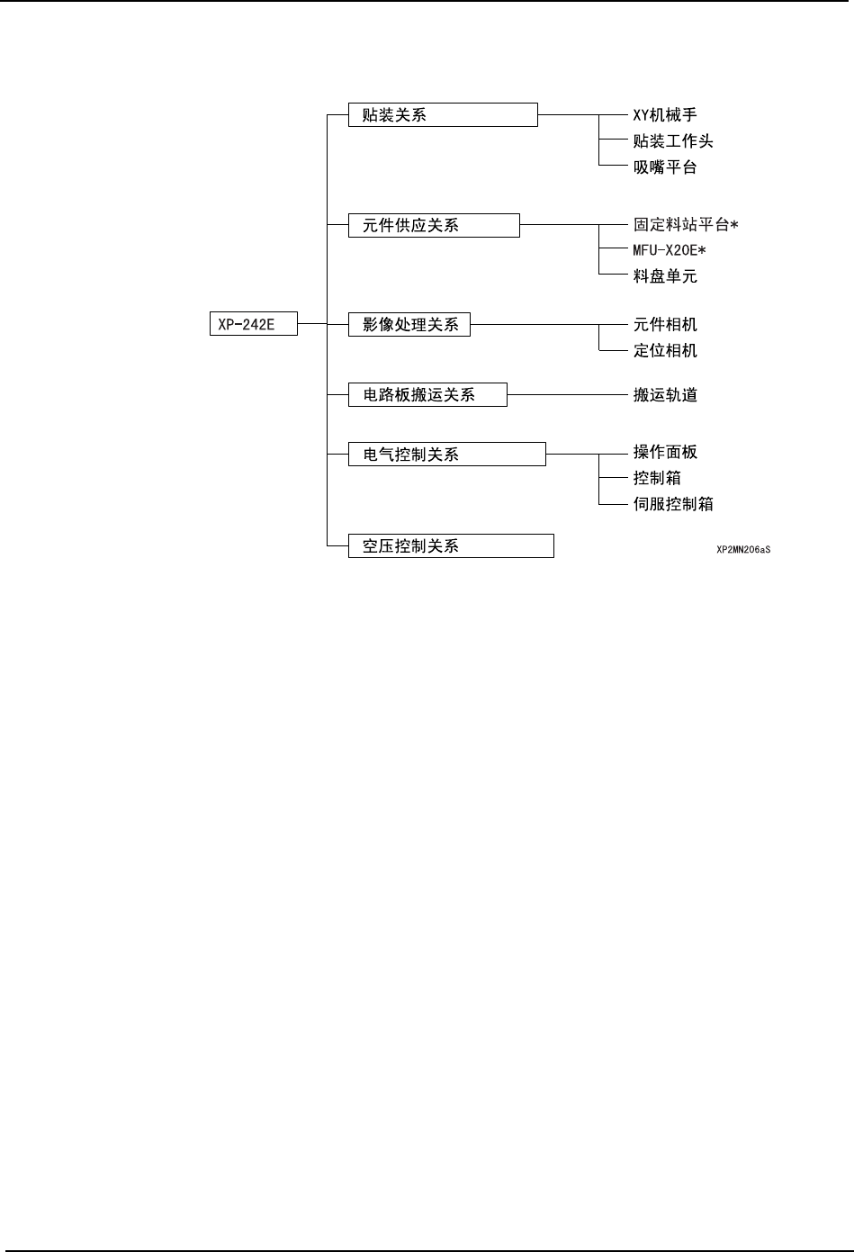 MEC-XP242-2.1S 2. 机器主体 XP-242E 机械手册 19 2.2 各部分的功能 * ∶固定料站平台/ MFU-X20 E 为机器制造时的选项,其中的一个单元被 装载在机器上。 2.2.1 贴装关系 XY 机械手 在 XY 机械手上装有贴装工作头,可向 X 方向以及 Y 方向移动。 贴装工作头 在贴装工作头上装有定位相机和 多个吸嘴头。 在吸嘴头上安装的吸嘴,由θ轴 和 Z 轴的独立马达来控制。 2.2.2 元件供应关…