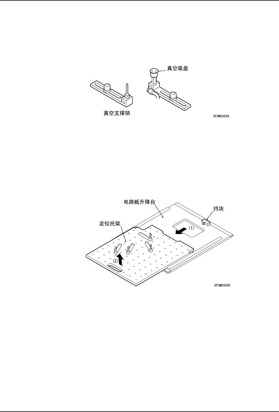 6. 请进行电路板升降台上升、下降的动作,并再次确认定位托架上的真空支撑销是否与搬
