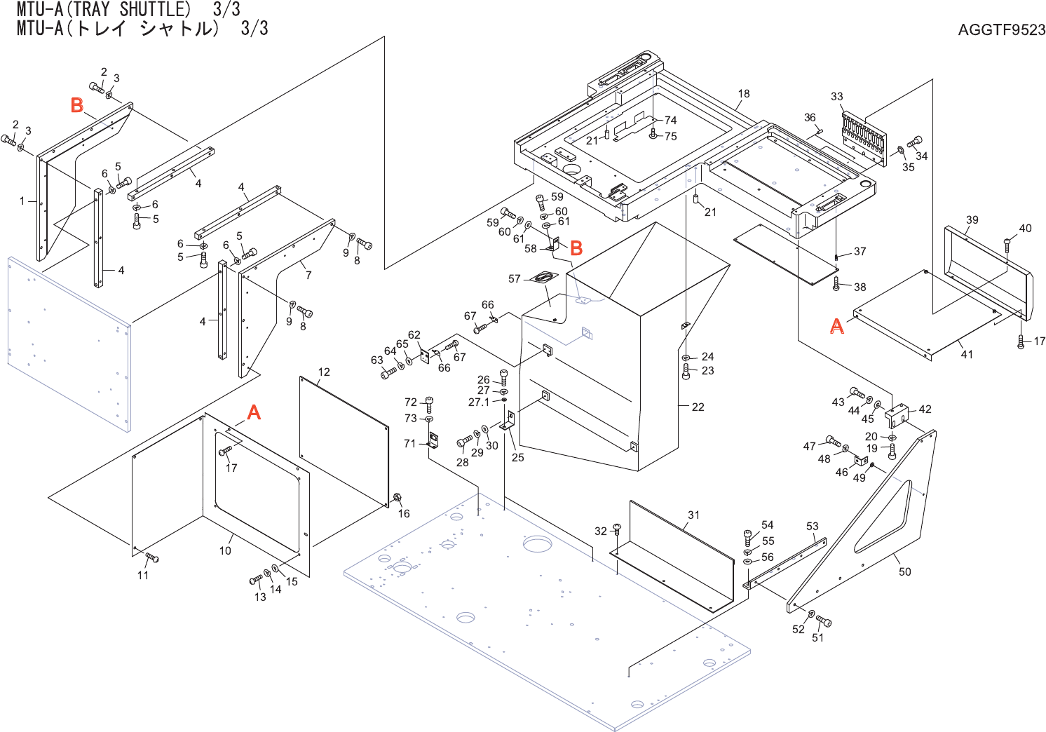 MTU-A(TRAY SHUTTLE) 3/3 MTU-A(トレイ シャトル) 3/3 AGGTF9523 No. Drg.No. & Code No. QTY Description Rating Materials Remarks 番号 図番 & コード番号 個数 品名 規格 材質 備考 1 GGTF1402 1 BKT, COVER BK T カバ ー FE 2 H5324A 6 BOLT, HEX SOCKET…