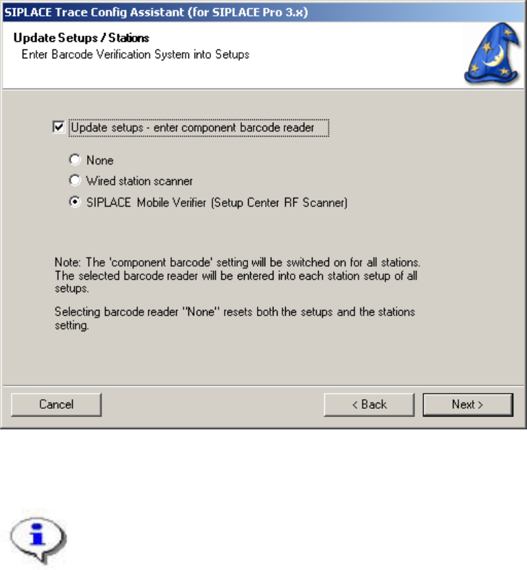 Options are to enter no barcode reader, the wired station scanner or SIPLACE Mobile Verifier. Latter is