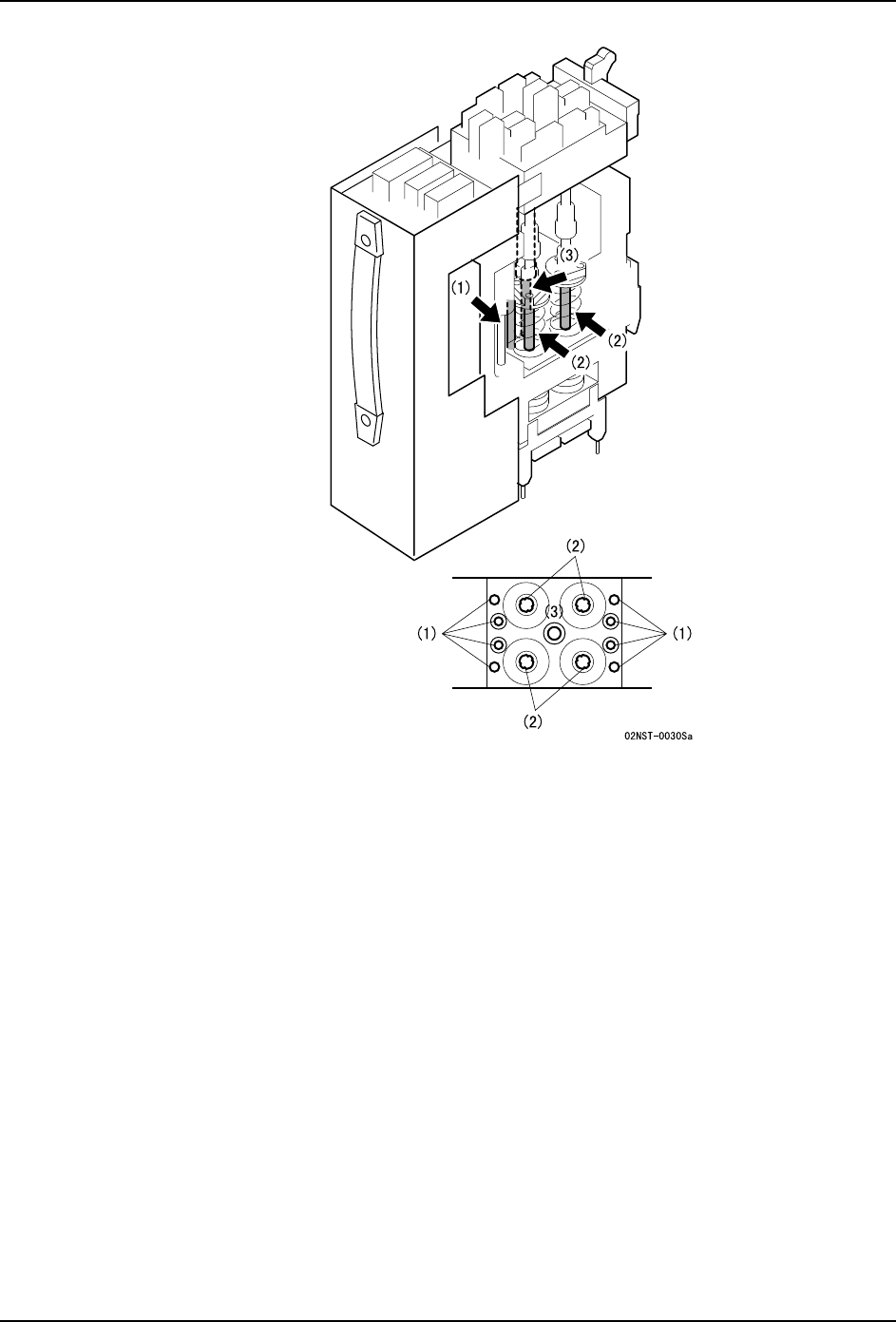 3. 使用细毛刷在吸嘴头 (A,B,C,D) 的轴 (2) 和吸嘴切换轴 (3) 处薄薄地涂敷指定的润