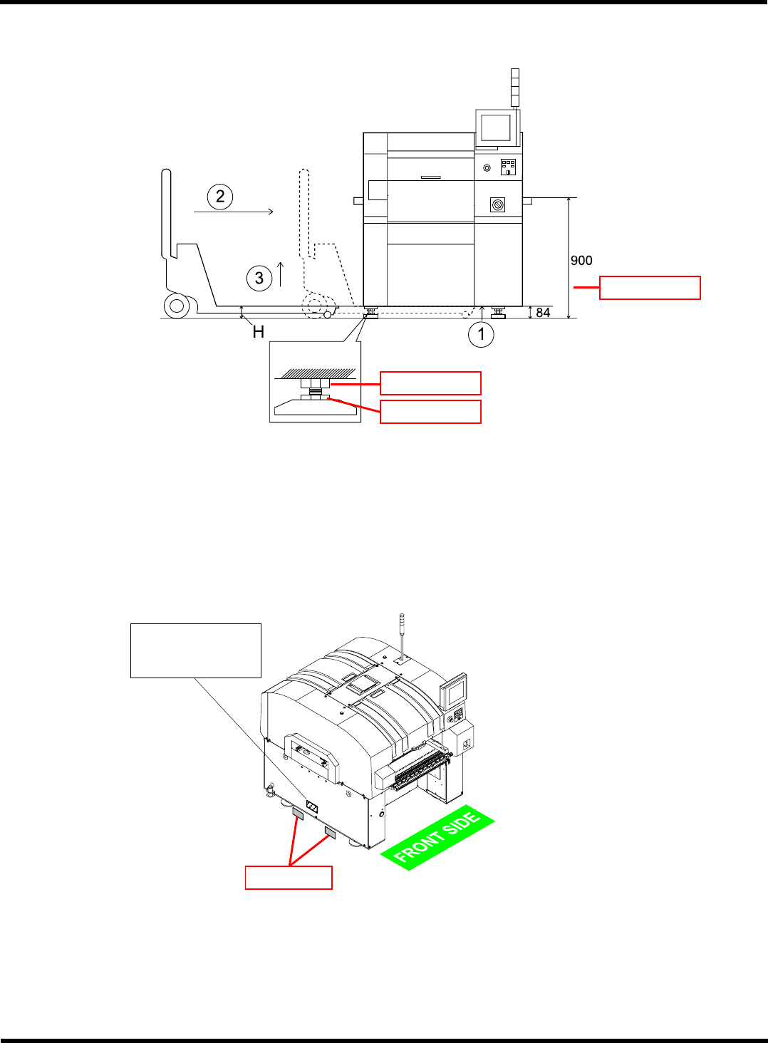CM101-D 安装手册 1.1 设置准备 Page 1-3 1.1.3 搬送 ∗ 关于卷盘座 ( 选购件 ) 、 整体交换台车 ( 选购件 ) 、 直接托盘供料器 ( 选购件 ) , 请在搬送之前务 必从 主体上拆卸。 ( 维修手册 ) A) 往载重汽车上装卸 时使用叉车或吊 车。 使用叉车时 请操作叉车,以使如下 图所示的中心标签与货叉中 心相吻合。 使用吊车时 ( 需用特殊的吊起工具。 ) ∗ 1: 带孔螺栓,请务必确 实…