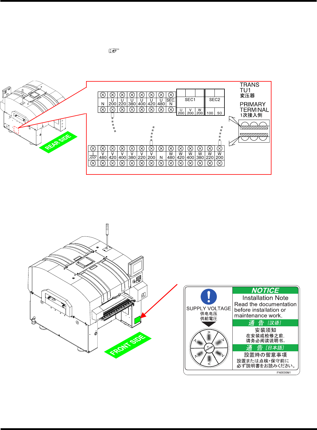 CM101-D 安装手册 1.1 设置准备 Page 1-6 3. 从本公司出货时的 变压器电压被设 定为与客户洽谈好 的设定值。 确认本 机的变压器电源分 支电压、以及贴 在本机上的供电电 压标牌上所 标明的 电压是否都与工厂 的供电电压设定 一致。 ∗ 在变更电压时,请参照 “1.1.5 可选择的电压等级 ” 。 变压器电源分支 例 : AC 20 0 V 的情况 供给电压表示标牌粘贴位置 供给电压表示标牌 ∗ 使用 AC …