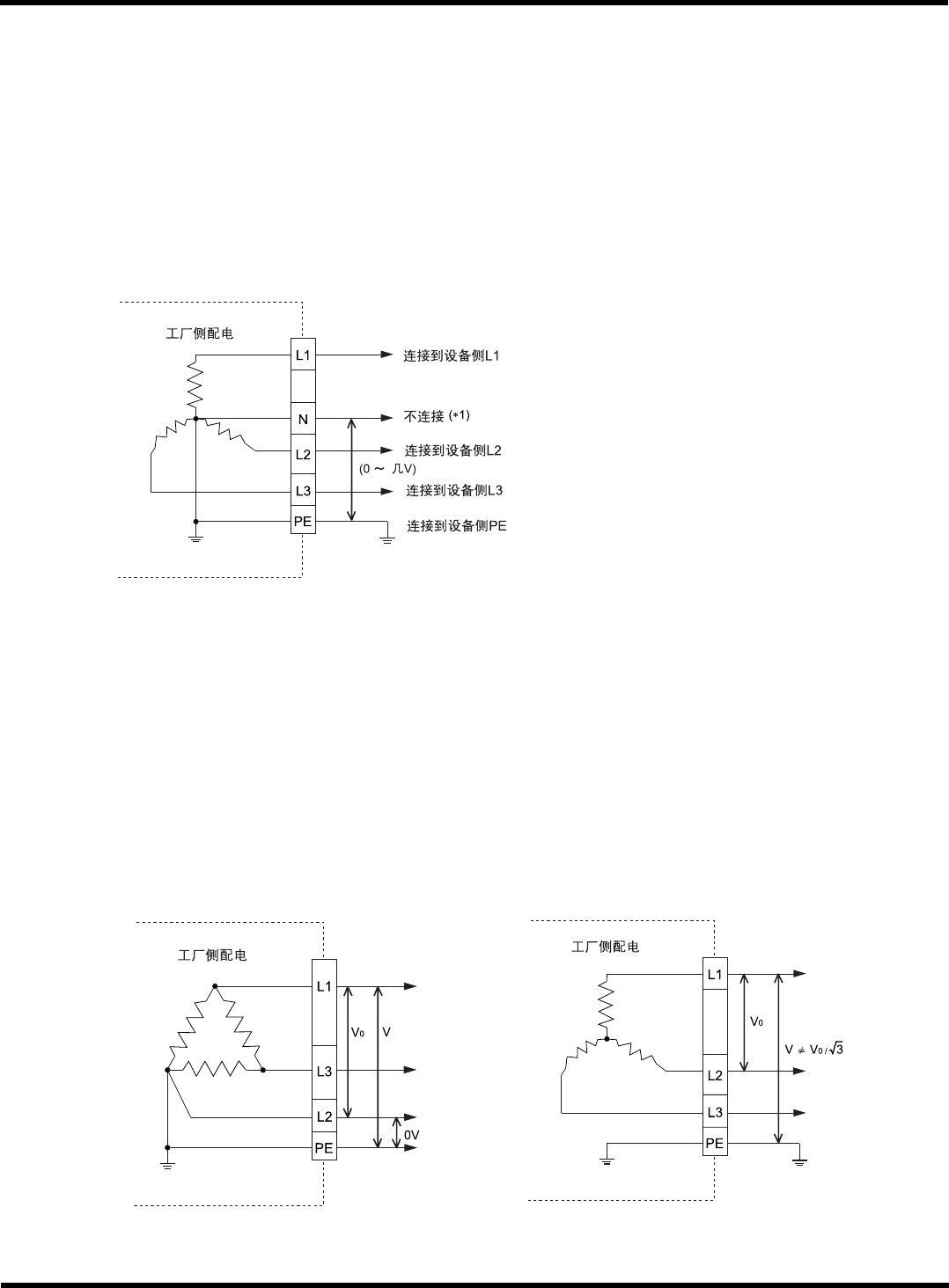 CM101-D 安装手册 1.1 设置准备 Page 1-8 电源有无接地的简易确认方法 ( 用检测器确认 ) ① L1 、 L2 、 L3 、 N 、 PE 的 5 条被拉出时 ( 星形接线 ) 请测量在 N 、 PE 之间的电压。 • 接地中性线时 数值几乎在 0 ∼ 几 V 的范围内稳定 → AC 290 V 以上可连接 • 未接地中性线时 数值不安定 ( 几十 V 以上时显示 ) → AC 290 V 以上不能连接 例 ) …