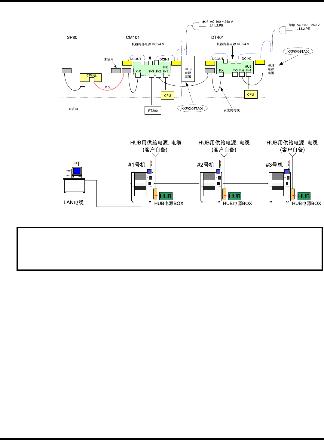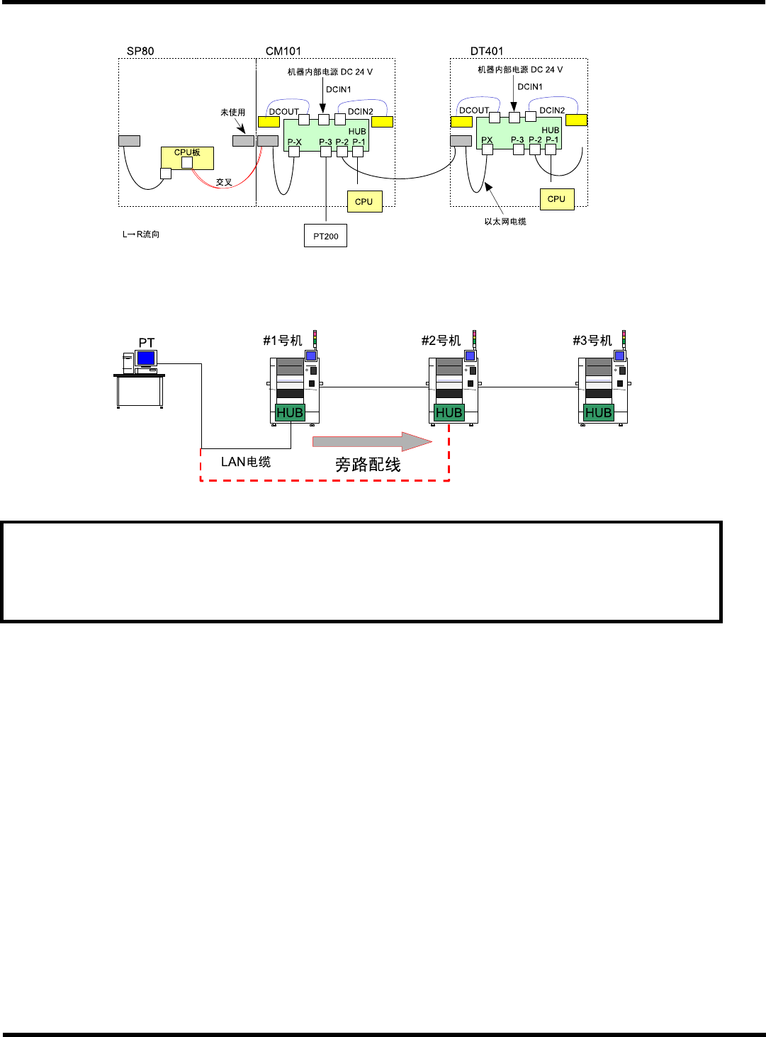 CM101-D 安装手册 1.3 周边装置和电缆的 连接 Pa ge 1- 31 ② HUB 控制器的连接 2 ( 搭载电源装置 : 选购件 ) ∗ 由于将 HUB 电源装置搭载 在各个机器上,所以经常可 以和电源开关未在 OFF (O) 状态的机器及 PT 进行通信。但是,如下 图所示各个机器上需要 HUB 用电源及连接电缆。 要求 请将 HUB 端口限制在 PT 系统及机械之间的通信。 未使用的端口请不要连接在公用电话交换回路网 (…