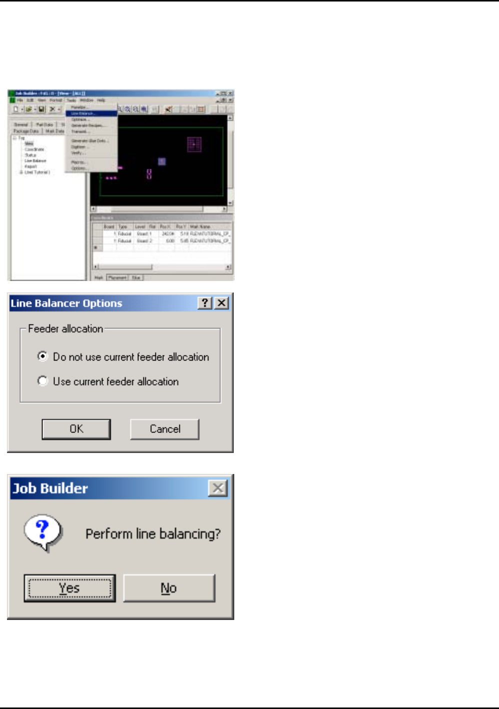 ETEN0631 3.F4G 数据 Fuji Flexa 学习手册 3-17 3-5. 平衡生产线 1. 从 Job Builder 的 [Tool] 菜 单 中 选 择 [Line Balance... ]。 显示出 [Line Balanc e Options] 对话框。 2. 选择 [Do no t use current feeder allocation ] 选项后单击 [OK] 键。 显示出 "Perform Li…