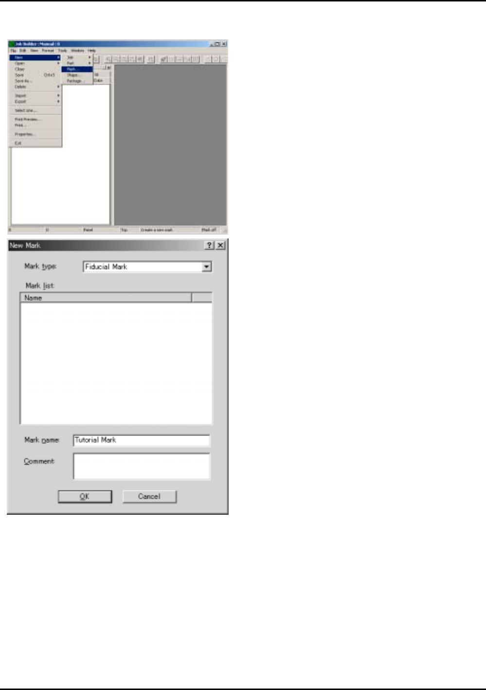 ETEN0631 5.手工输入 Fuji Flexa 学习手册 5-9 5-4. 制作定位点数据 2. 在 [Mark Typ e] 栏里选择 [ Fiducial Mark], 在 [M ar k N am e] 字段里输入 "T ut or ia l M ar k "后单 击 [OK] 键。 显示出 [Fiducial Mark: Tutorial Mark] 视 窗。 1. 从 [File] 菜单里依次选 择 …