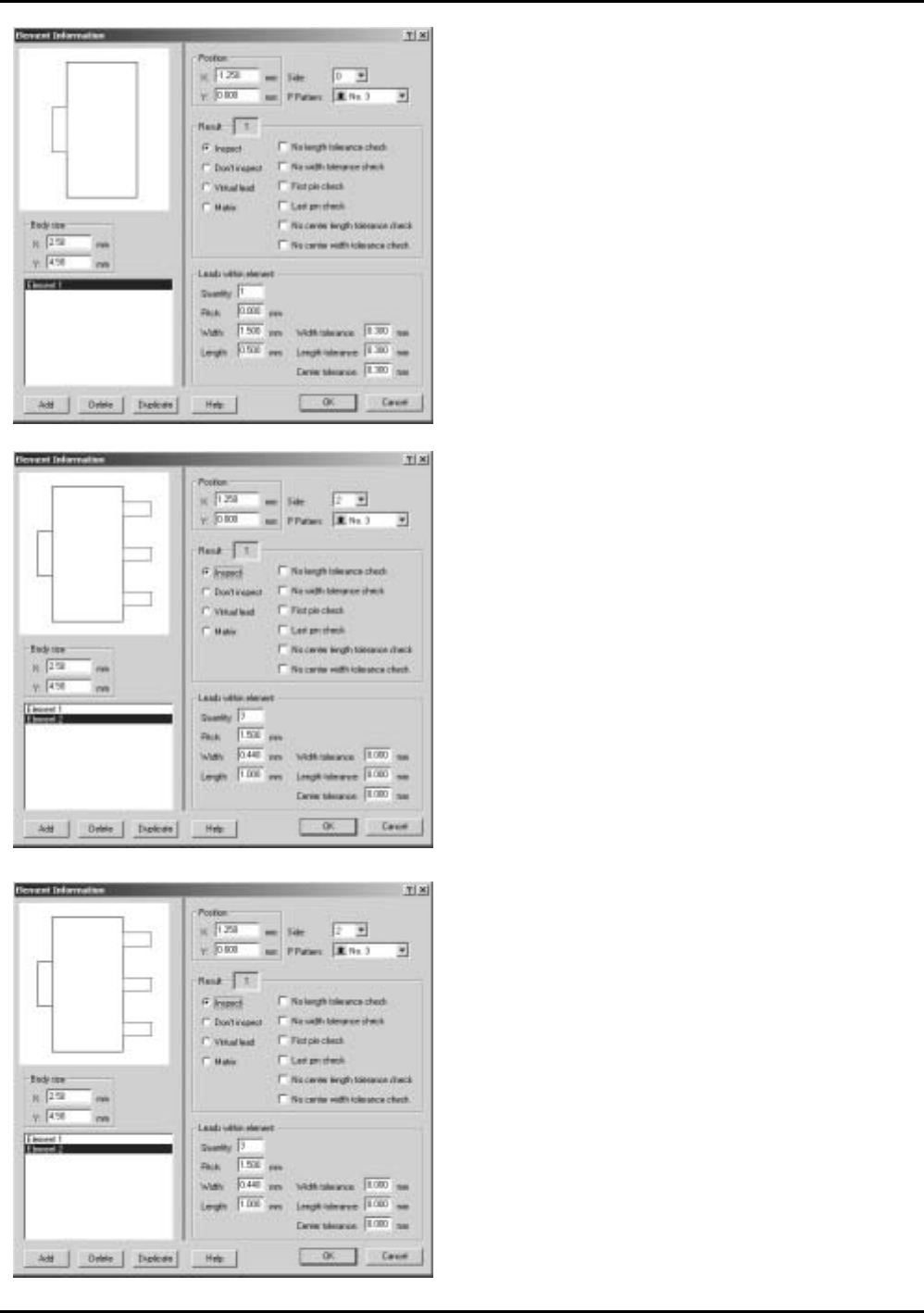 5.手工输入 ETEN0631 5-14 Fuji Flexa 学习手册 10.单击 [OK] 键。 [Element Inf ormation] 对话框被关闭。 9. 单击 [Add ] 键后输入下列的数值作为 [El ement 2]。 Position X : 1.250 Position Y : 0.000 Side: 2 P Pattern: 3 Result: 1 Quantity: 3 Pitch: 1.500 Width…