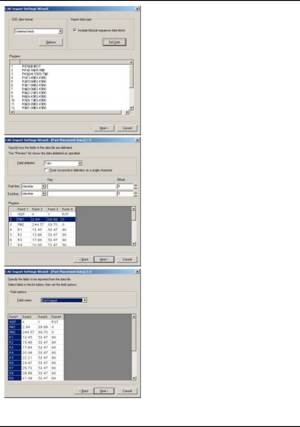 1.Centroid CAD 数据 ETEN0631 1-8 Fuji Flexa 学习手册 13. 选 择 [Field 1] 后 从 [Field n ame] 下 拉 式 列 表框中选择 [Reference]。 12.从 [Field Delimi ter]下拉式列表中选择[Tabs] 后单击[Next]。 显 示 出 [CAD Impor t Setup Wizard [Part Allocation D ata] 2/2] …