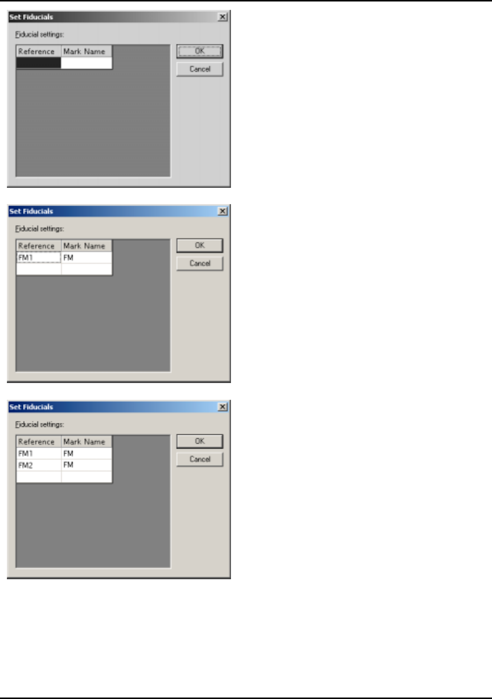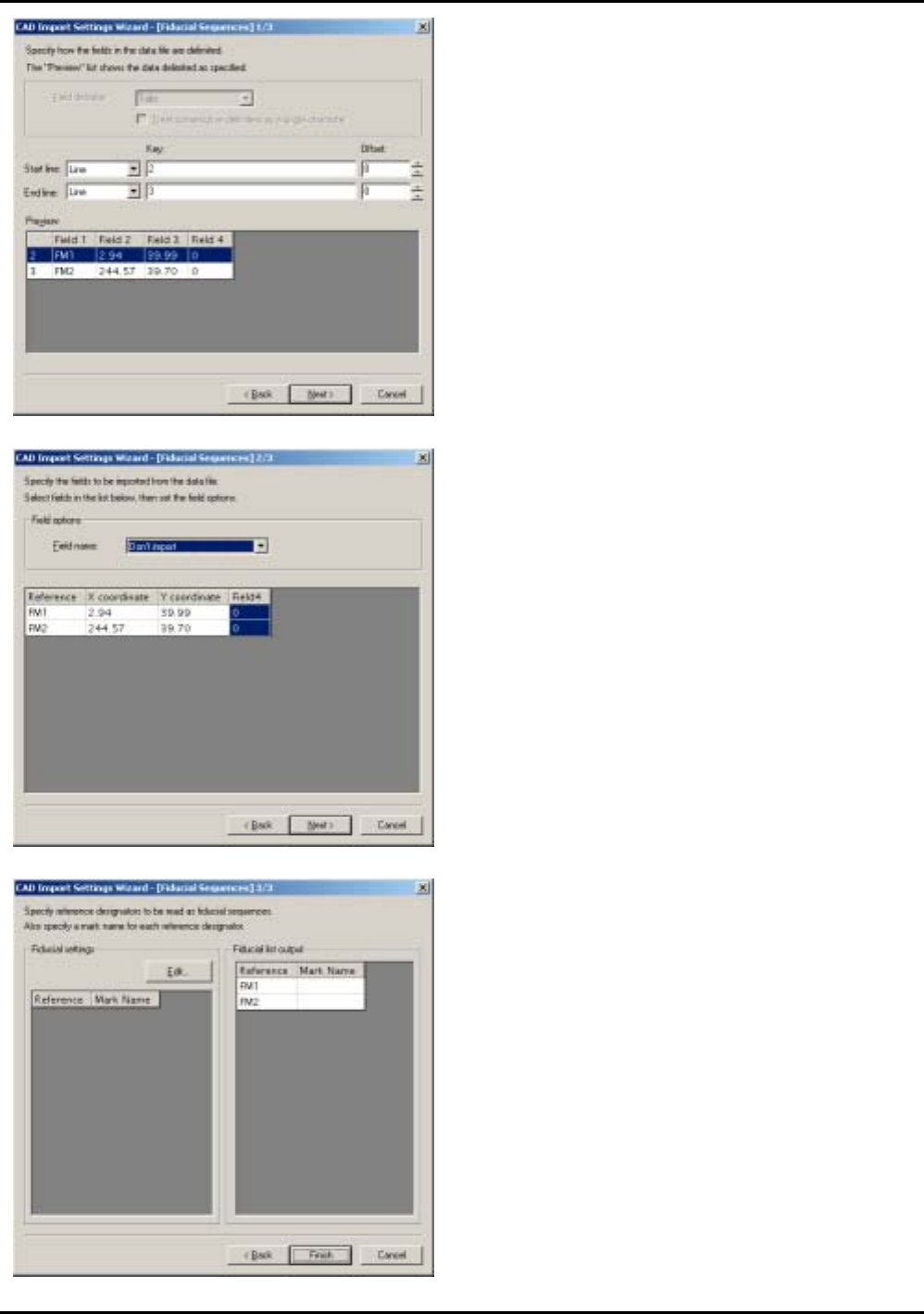 1.Centroid CAD 数据 ETEN0631 1-10 Fuji Flexa 学习手册 17.单击 [Next]。 显示出 [CAD Import Setup Wizard [Fiducial Sequences] 2 /3] 对话框。 19. 在 [Fi ducial setti ngs] 部分单击 [Edit]。 显示出 [Set Fiducia ls] 对话框。 18.从 [Field name] 下拉式列表中选择下列字段…
