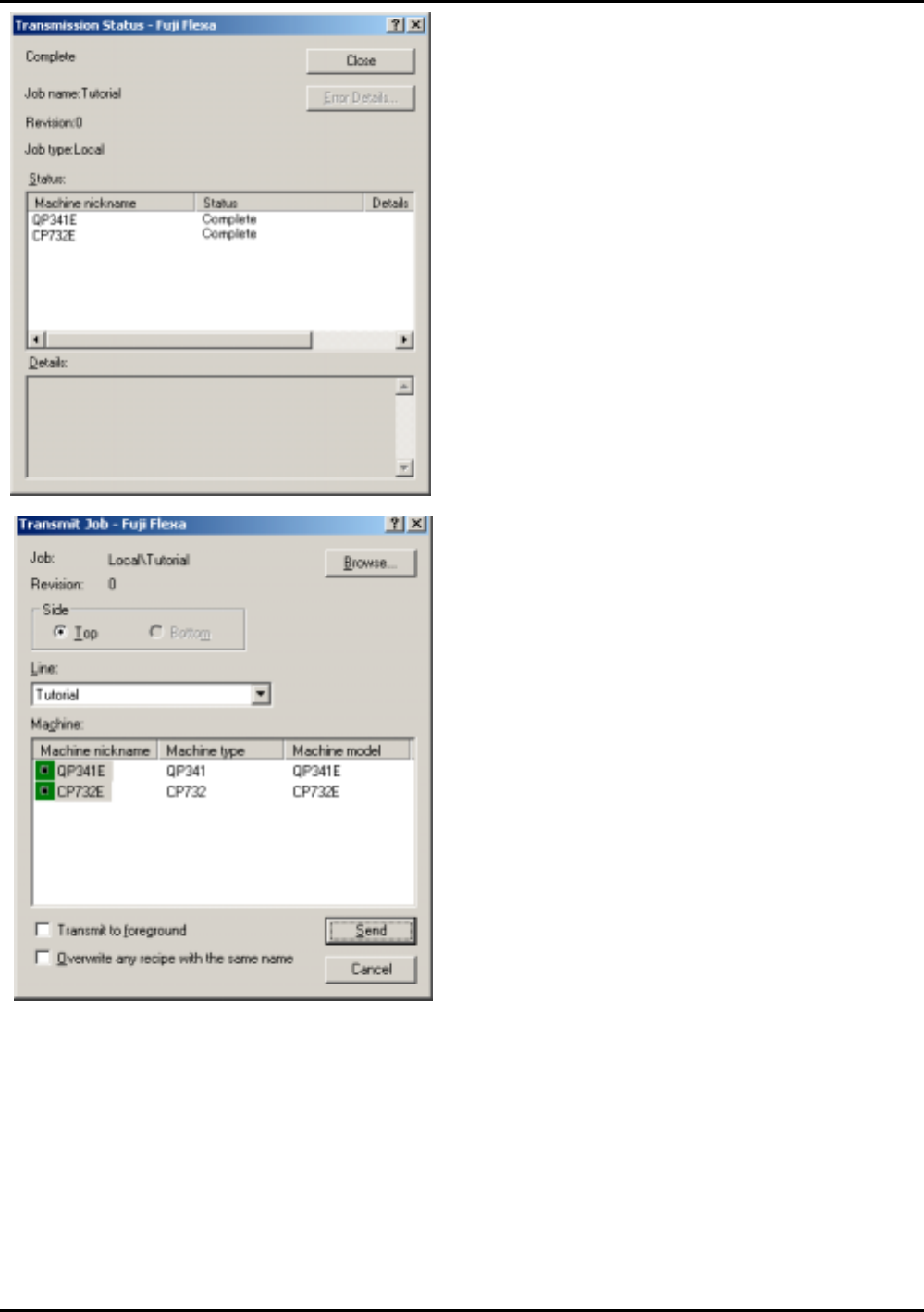 ETEN0631 1.Centro id CAD 数据 Fuji Flexa 学习手册 1-39 6. 单击 [Cancel] 键去 关闭 [Transm it Job] 对 话 框。 机器上的生产程序名变为“生 产程序名_面(上 T 下 B)Revi sion 号码” 。 5. 一 旦 完 成 , 在 [Transmissi on Sta tus] 视 窗 上 单击 [Close] 键。 显示出 [Transmit Jo b] 对话框…