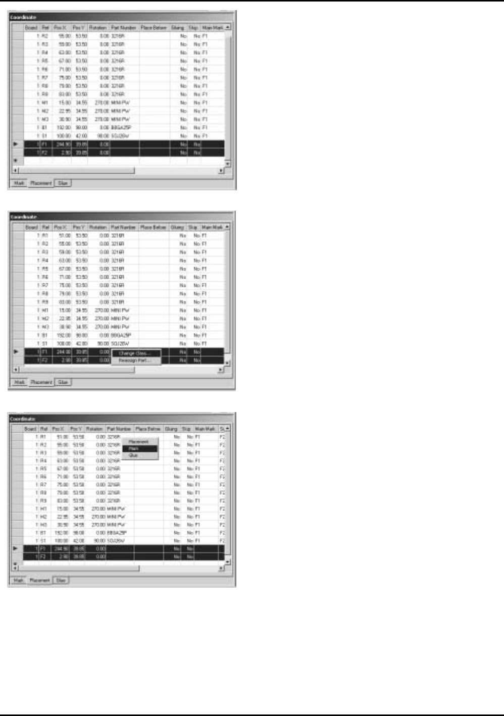 2.CAD 数据 ETEN0631 2-16 Fuji Flexa 学习手册 5. 从第二个菜单中选择 [Mark]。 两个顺序被移到 [Mark] 标号。 4 . 右击被选择的顺序 后,从快捷菜单中选择 [Change Cl ass … ]。 显示出第二个快捷菜单。 6. 选择 [Ma rk] 标号去确认 已经增加了基准定位点 的顺序。 FLXTB027 FLXTB028 FLXTB029