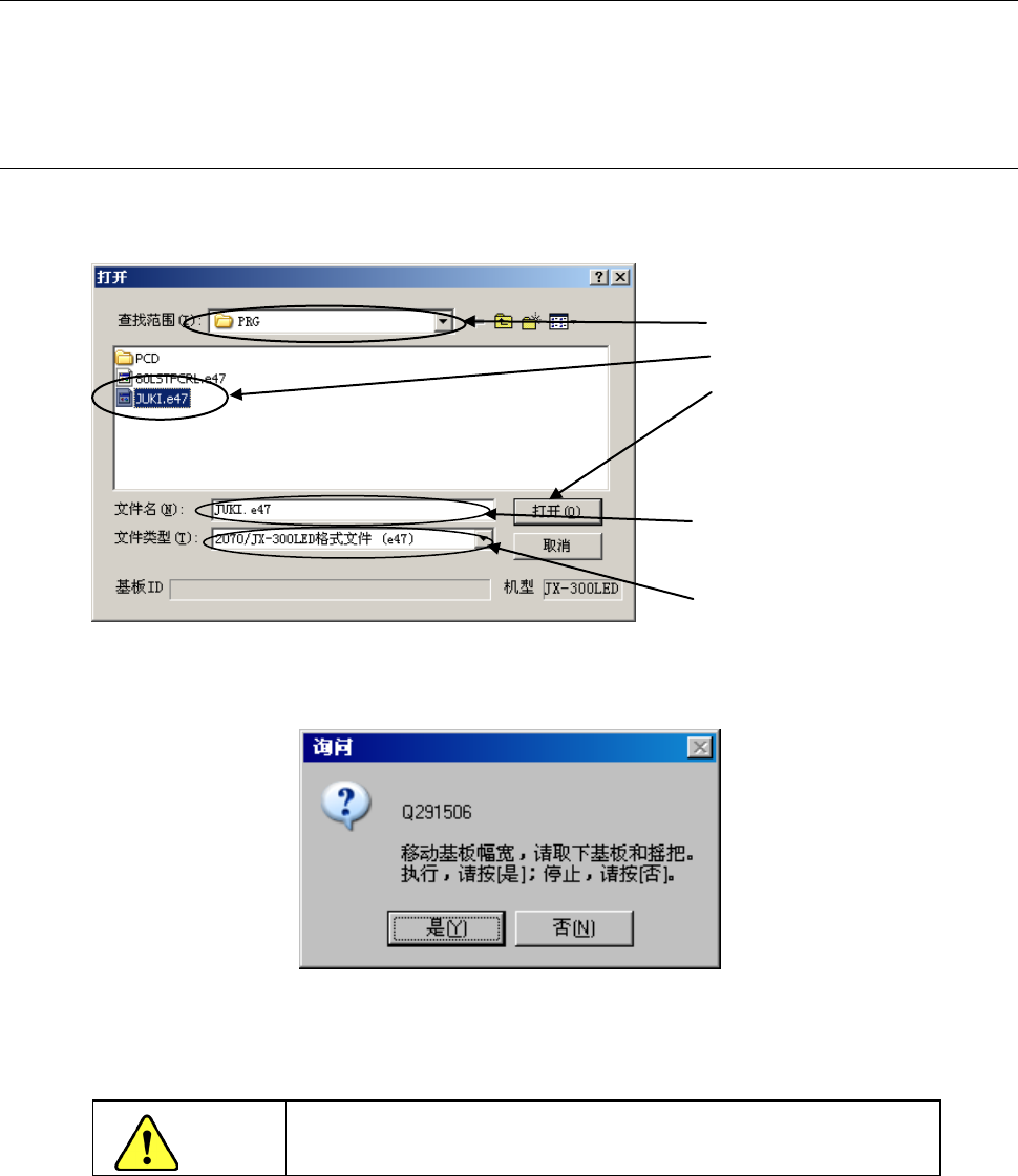 第 1 部 基本篇 第 2 章 生产 2-6 文 件操作 进行生产时,需打开生产程序文件。 在“生产”画面中如果变更了数据,或为了保存生产管理信息,也可保存变更数据。 2-6-1 打开(读入文件) 读入已经制作好的生产程序文件。 从菜单栏中单击”文件” / ”打开” ,则显示如下画面。 选择文件名,单击”打开” ,读入 选择 的文件。 图 2-6-1-1 有基板宽度自动调整装置(选购件)时,将显示下列询问。 图 2-6-1-2 询问基板…