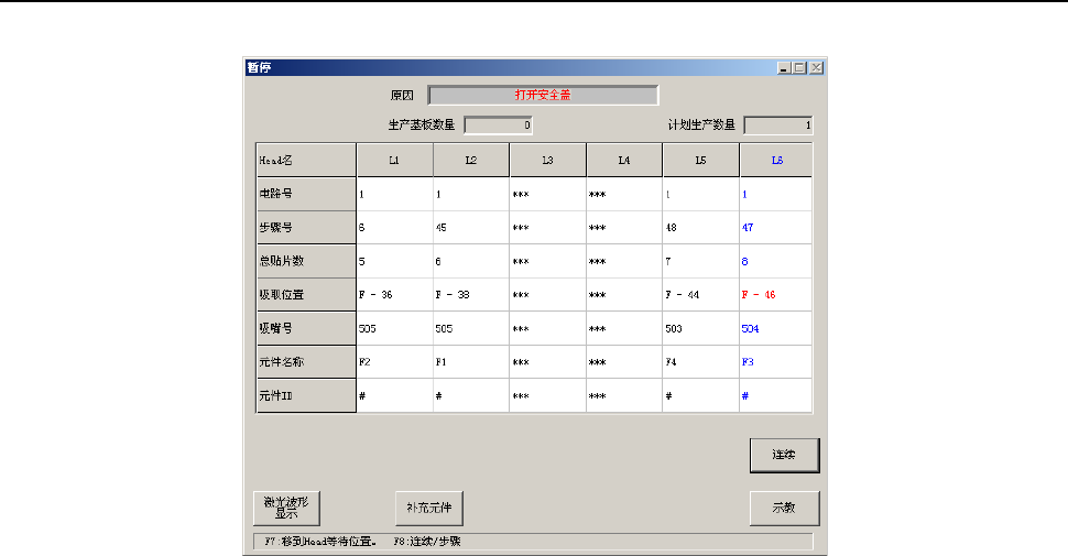 在生产运行中(XY轴移动中)检测出供料器悬浮时,会显示如下信息,并进入暂停状态。