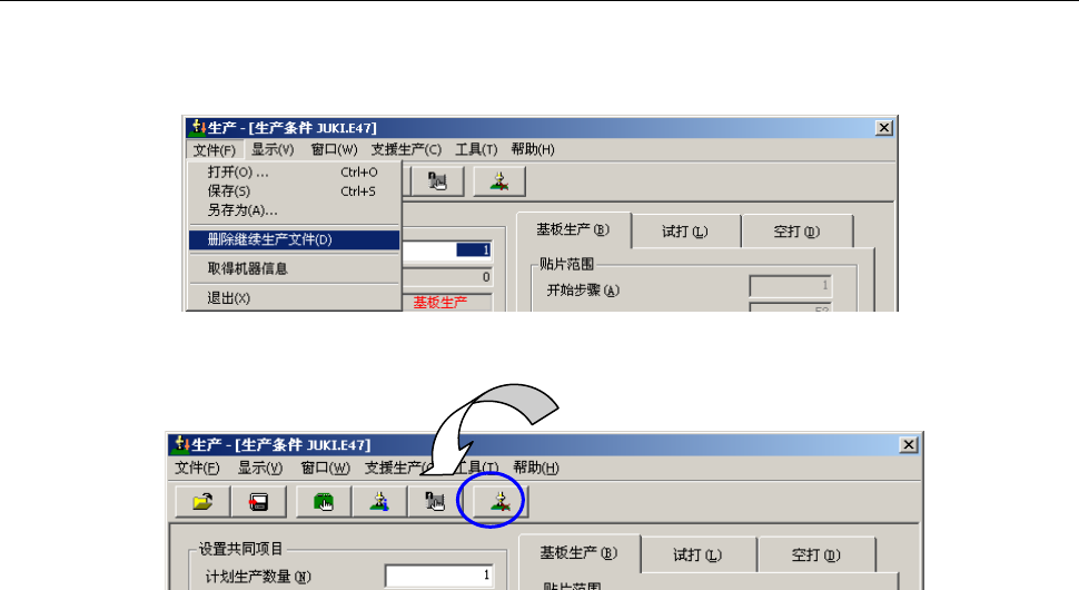 继续生产数据存在时,菜单栏中的“文件”/“删除继续生产文件”与工具栏的按钮显示为有效。
