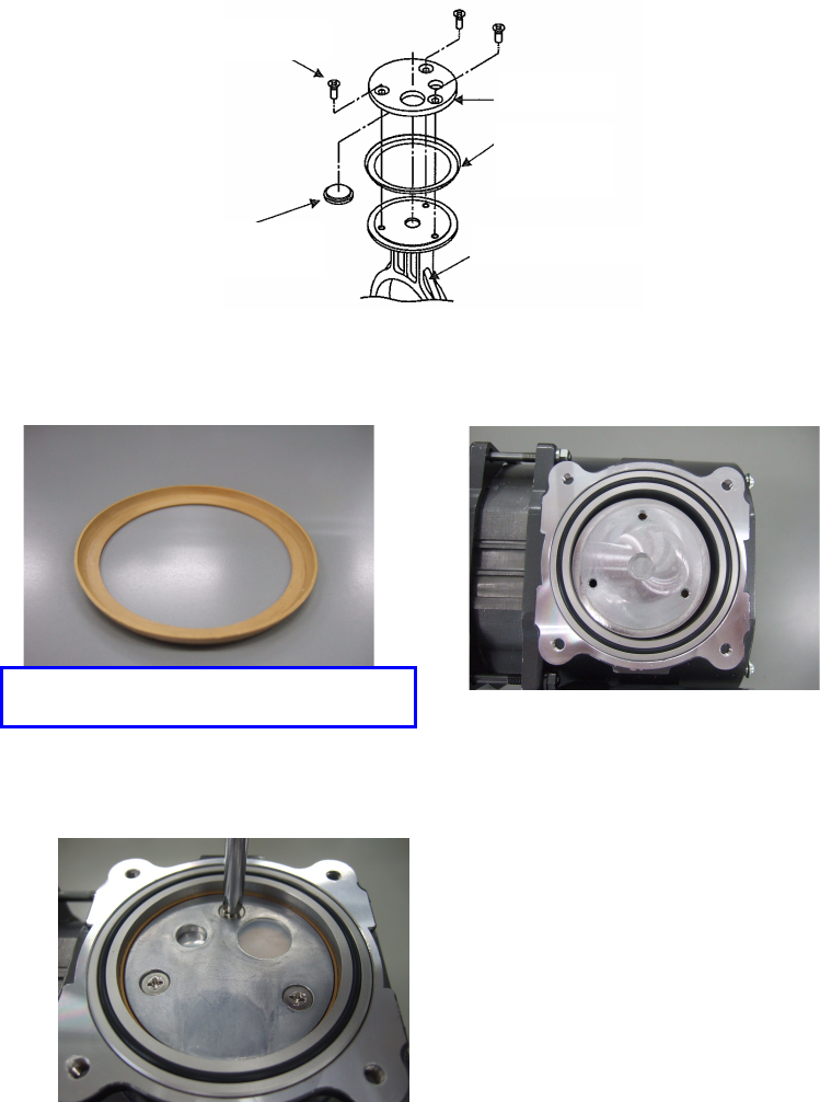 第 1 部 基本篇 第 3 章 维护 ○ 吸气阀、排气阀的更换 1 ) 松开圆头螺钉 (M3×5) ,按下并取下排气阀。 2 ) 擦干净泵头盘,换成新的排气阀。 3 ) 盖上排气阀按压件, 用涂抹了螺钉松动防止剂 ( Loctite242 ) 的圆头螺钉 (M3×5) ,以 0 .8N ・ m , 固定在泵头盘上。 4 ) 松开固定吸气阀的圆头螺钉 (M3×5) ,取下吸气阀和平垫片。 5 ) 擦干净泵头盘,更换新的吸气阀。 6 ) 叠…