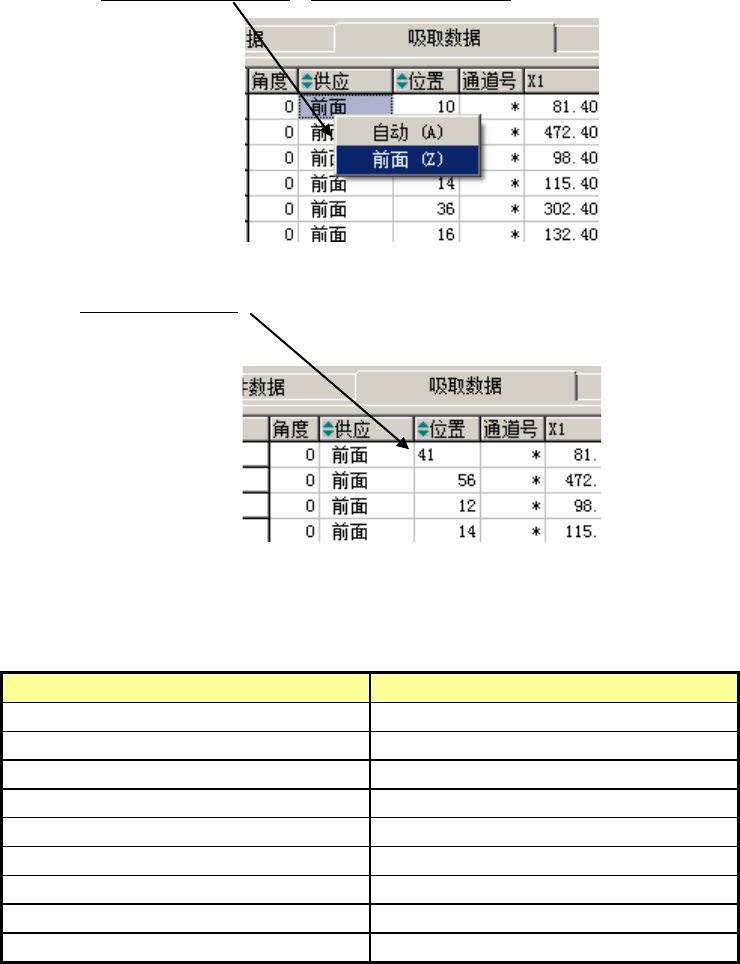 可在表格画面中编辑“角度”、“供应”、“位置(编号)”、“通道号”、“吸取坐标”、
