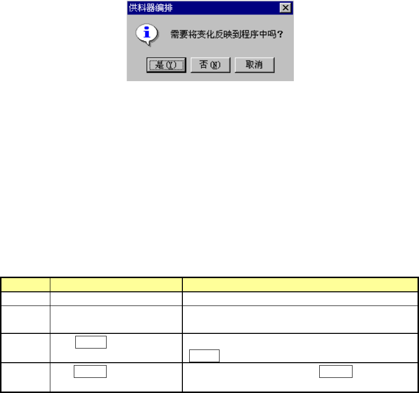 编辑后关闭供料器安排、站台选择画面时,会显示下列信息,询问是否把编辑内容反映到程序数