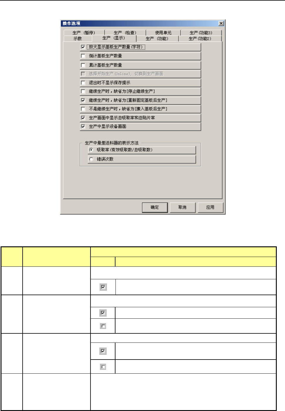 表6-2-2-1 生产时显示选项设置项目的细节和内容